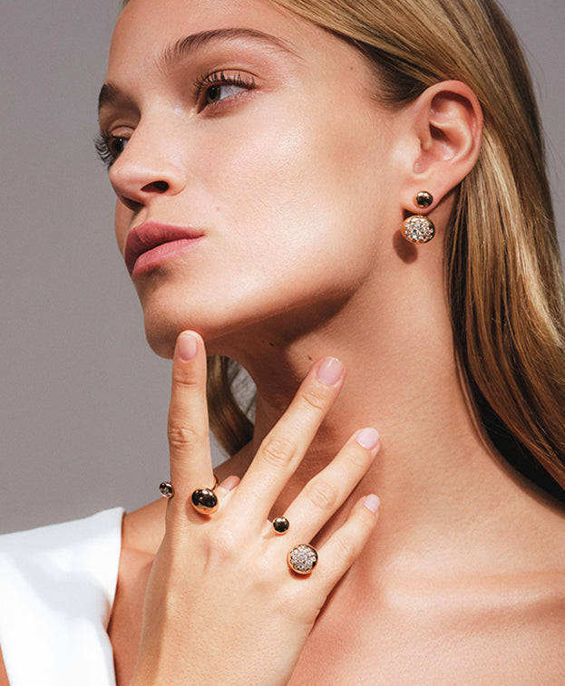 Anello in oro con boule lucida oversize e dettaglio pavé di diamanti su sfera più piccola. Il design aperto evoca un effetto piercing raffinato, minimal e grafico. La luce si riflette sulle superfici curve, creando un equilibrio tra sensualità e architettura. Un gioiello Glamour...- 3.410,00€