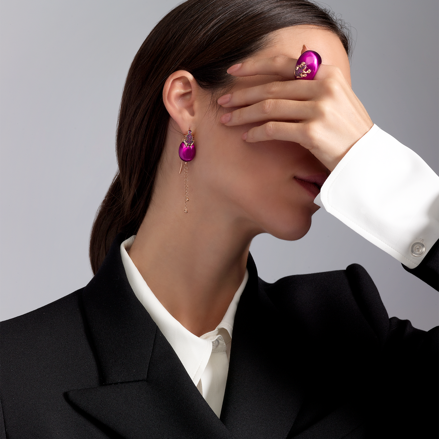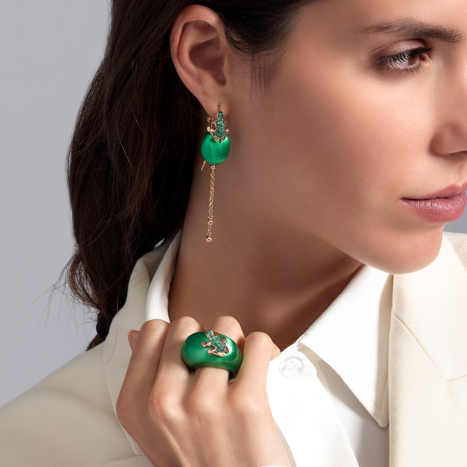 Design inaspettato per gli orecchini Happy Frog asimmetrici: il pendente presenta una pepita colorata su cui si arrampica la rana iconica in oro e pietre preziose, accompagnata da una cascata di catenelle mobili. Il secondo orecchino, a lobo, propone la rana in versione mini....- 3.700,00€