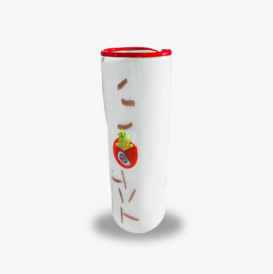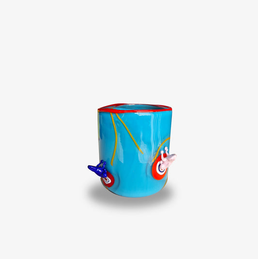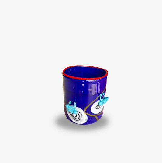 Bicchiere in vetro sonoro realizzato a mano nelle antiche fornaci di Murano, parte della collezione artistica “Come rane in uno stagno” firmata da Roberto Bertazzon. Ogni pezzo è unico, lavorato con la tecnica dell’incalmo di filigrana e decorato con murrine esclusive. L’elemento distintivo è...- 410,00€