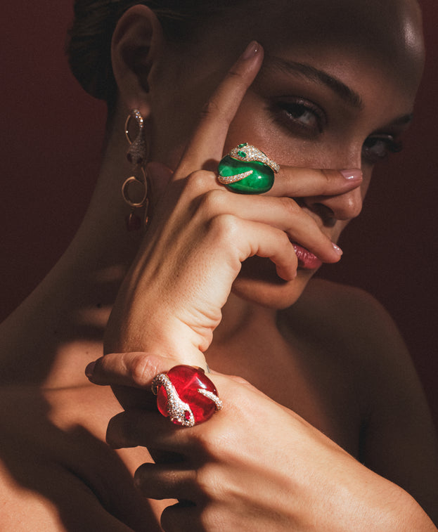 A statement ring from the Malafemmina collection, featuring a large apple carved from natural stone, marked by a bite. The snake coils around it, paved with diamonds and navette eyes in precious stones. An iconic piece that celebrates the boldness, desire, and courage of...- 14.300,00€
