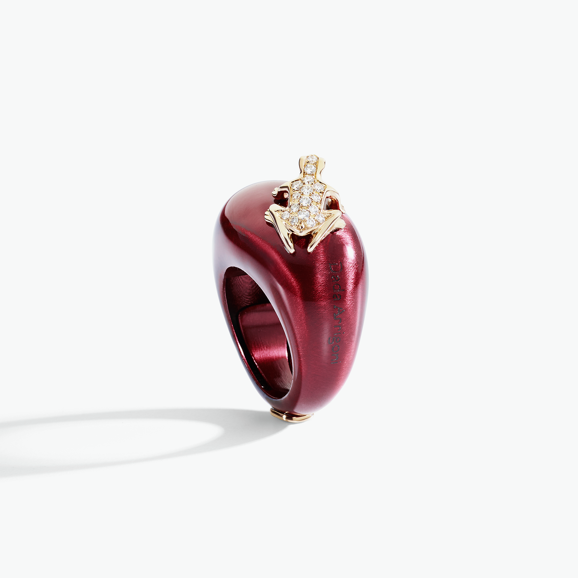 The most beloved design from the Happy Frog collection, in a balanced and versatile version. The stone shape embraces the gold frog with precious stones, creating a graphic and refined contrast. A sculptural and ironic piece, perfect for everyday wear. The color is achieved through cataphoresis in the metal versions, and by hand painting in the other colors. Any imperfections in the color are a testament to this craftsmanship. The color is weather-resistant but not scratch-resistant. An internal spring allows for a two-size reduction.