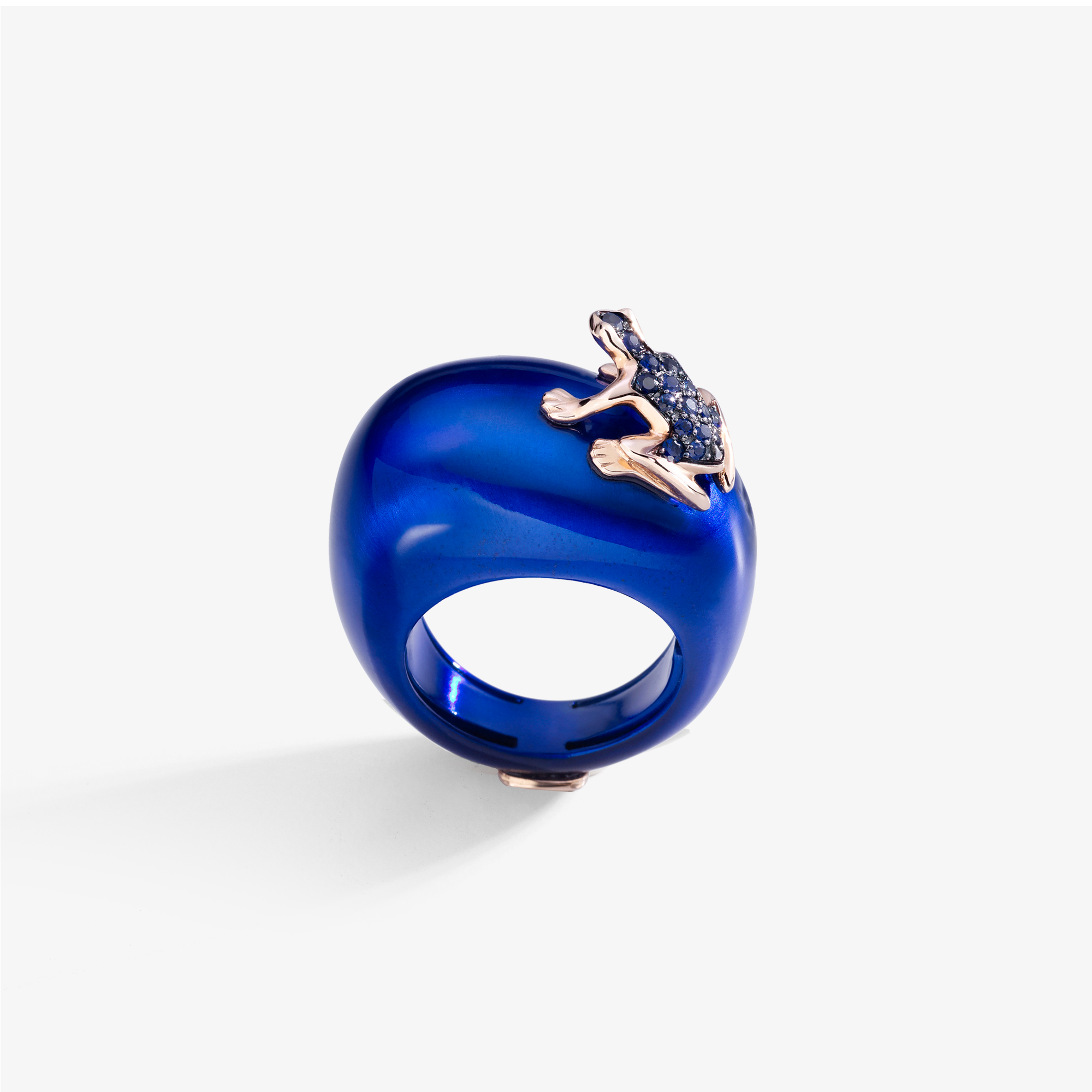 The most beloved design from the Happy Frog collection, in a balanced and versatile version. The stone shape embraces the gold frog with precious stones, creating a graphic and refined contrast. A sculptural and ironic piece, perfect for everyday wear. The color is achieved through cataphoresis in the metal versions, and by hand painting in the other colors. Any imperfections in the color are a testament to this craftsmanship. The color is weather-resistant but not scratch-resistant. An internal spring allows for a two-size reduction.