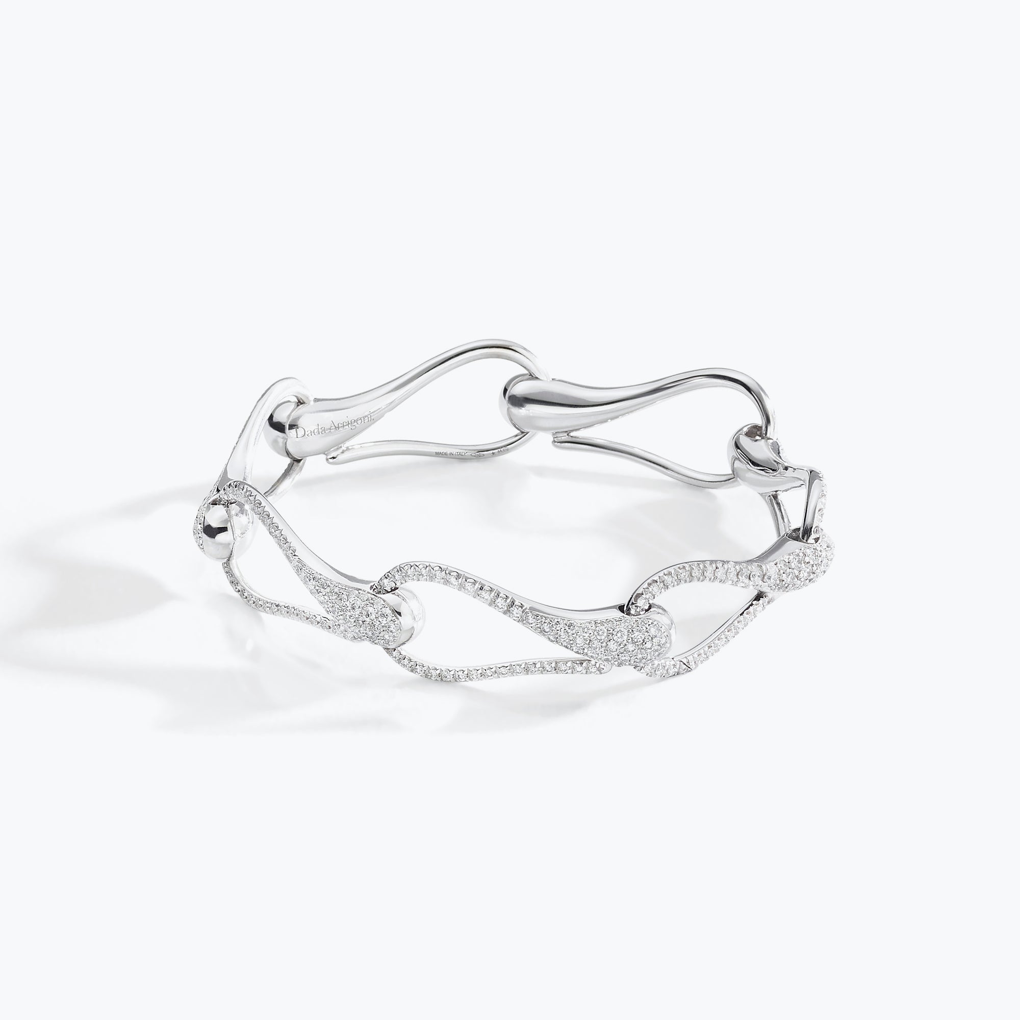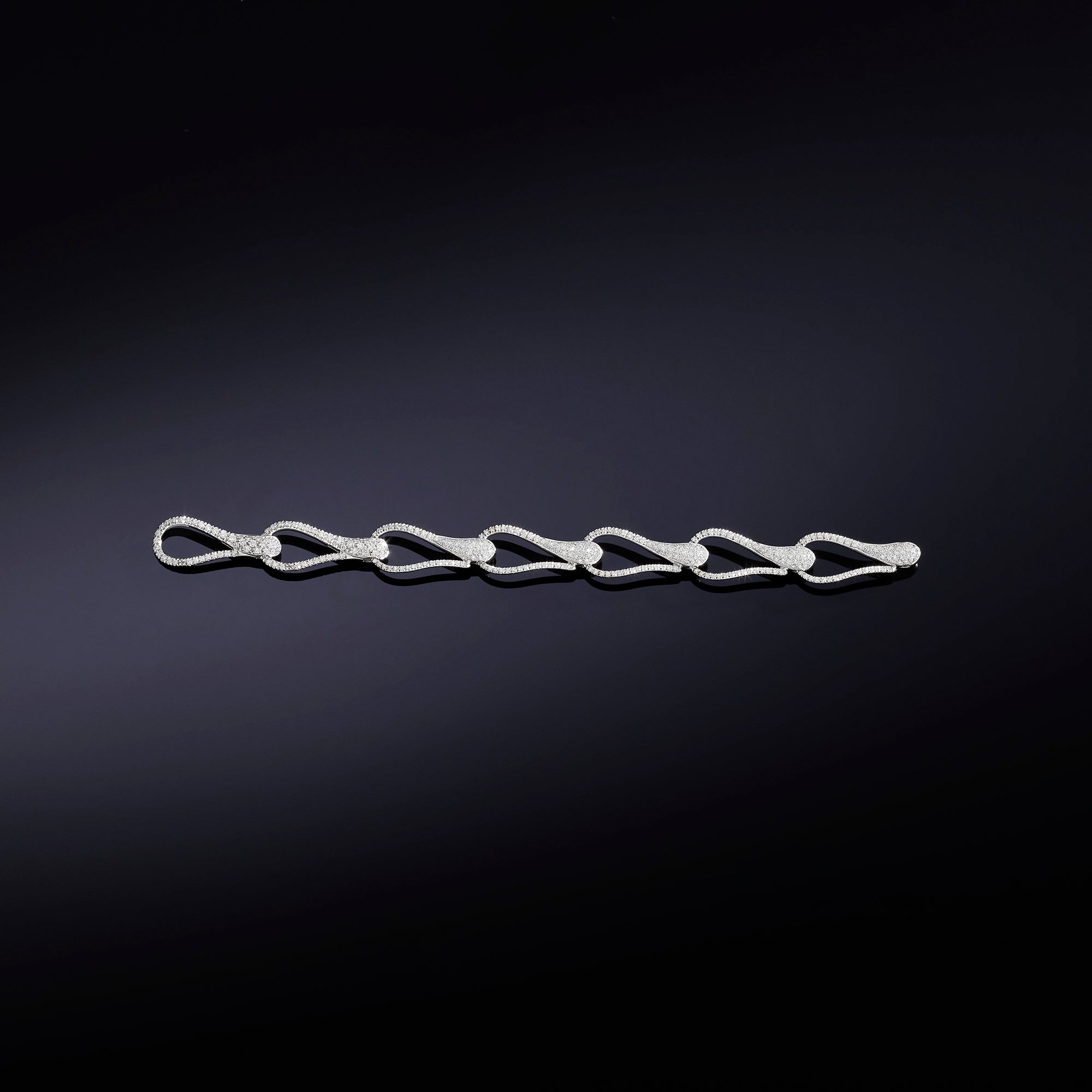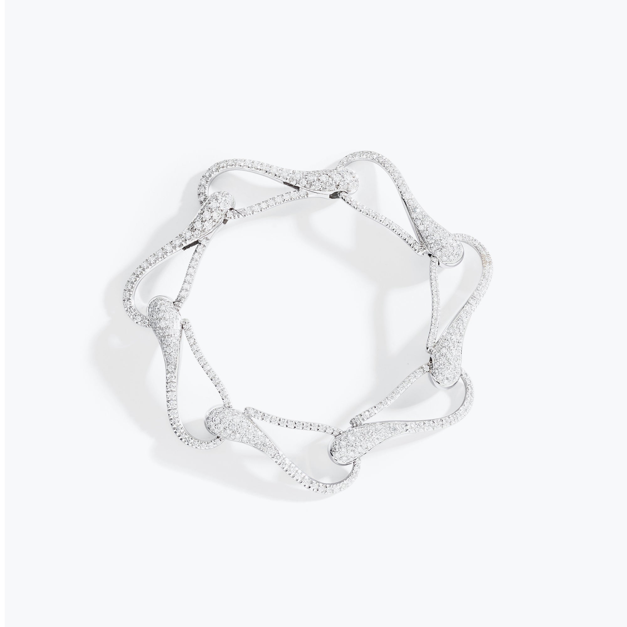 The Elika bracelet features a repetition of the iconic module, inspired by the spiral flight of a maple seed. Each element is entirely covered in diamond pavé, creating a deep, continuous, and vibrant light effect. The sculptural, fluid design is completed with an invisible clasp integrated into one of the modules. It can be attached to the Elika chain to create a dramatic piece of jewelry, perfect for a special occasion.