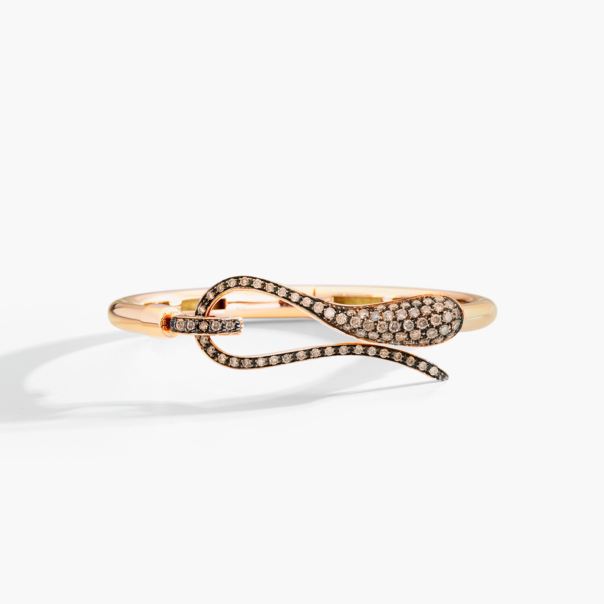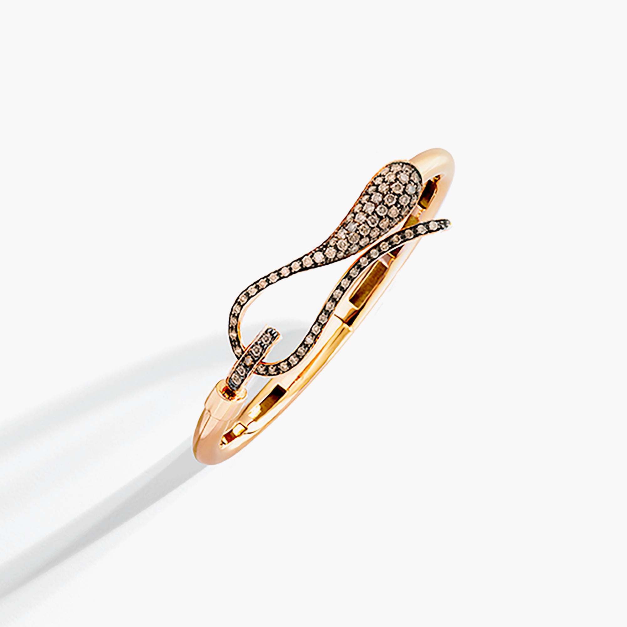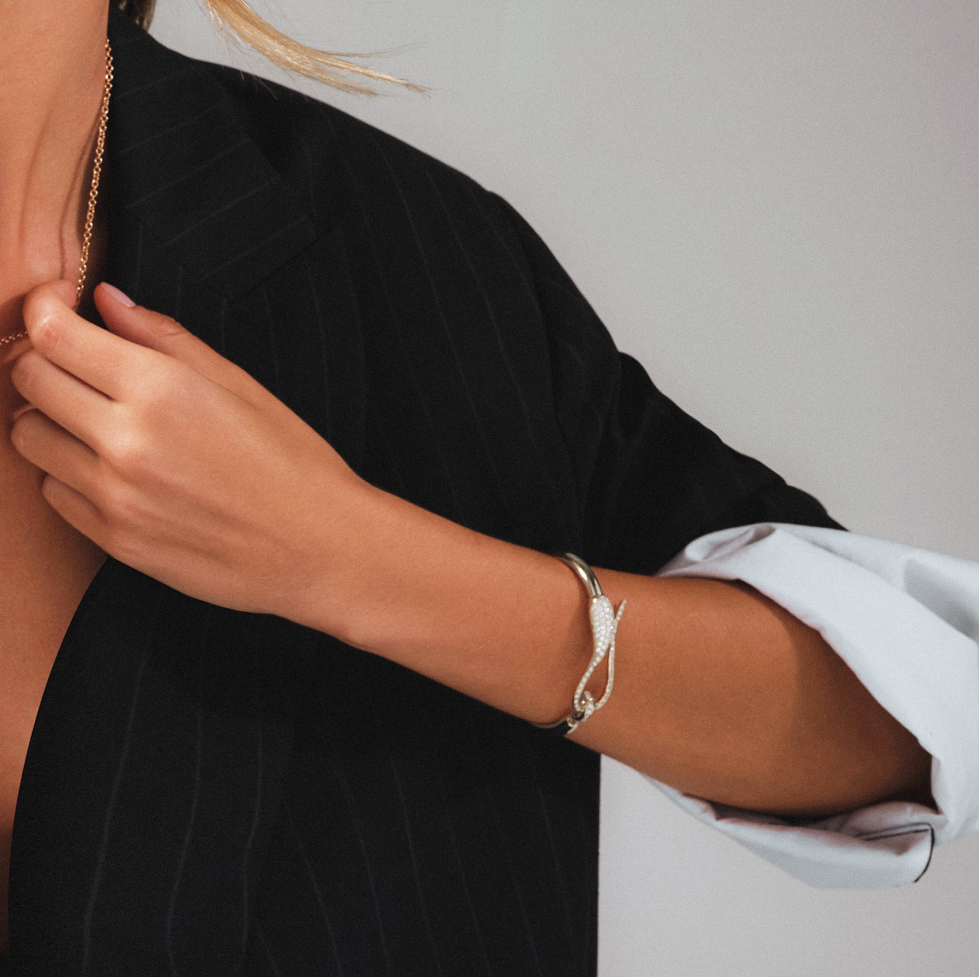 Elika gold bangle with a larger central module entirely paved with diamonds. The design, inspired by the spiral flight of a maple seed, remains pure and recognizable. It rests on an architectural structure with an integrated invisible hinge. A luminous and bold piece for those who love the strength of essential forms and the beauty of fine jewelry.
