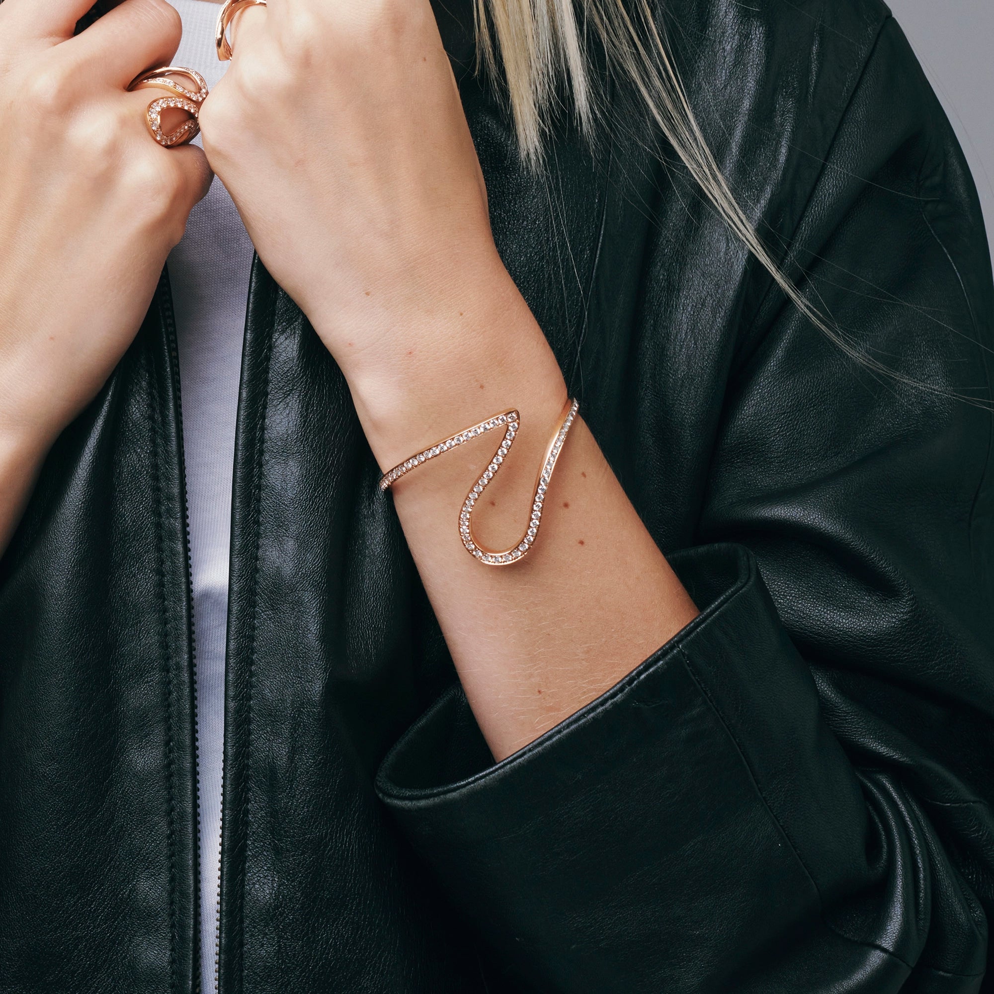 A curvy, refined bangle with pavé diamonds and a side hinge. The enveloping shape elegantly follows the movement of the wrist, transforming light into a distinctive signature. A sculptural piece that expresses transformation and femininity with bold character and understated style.