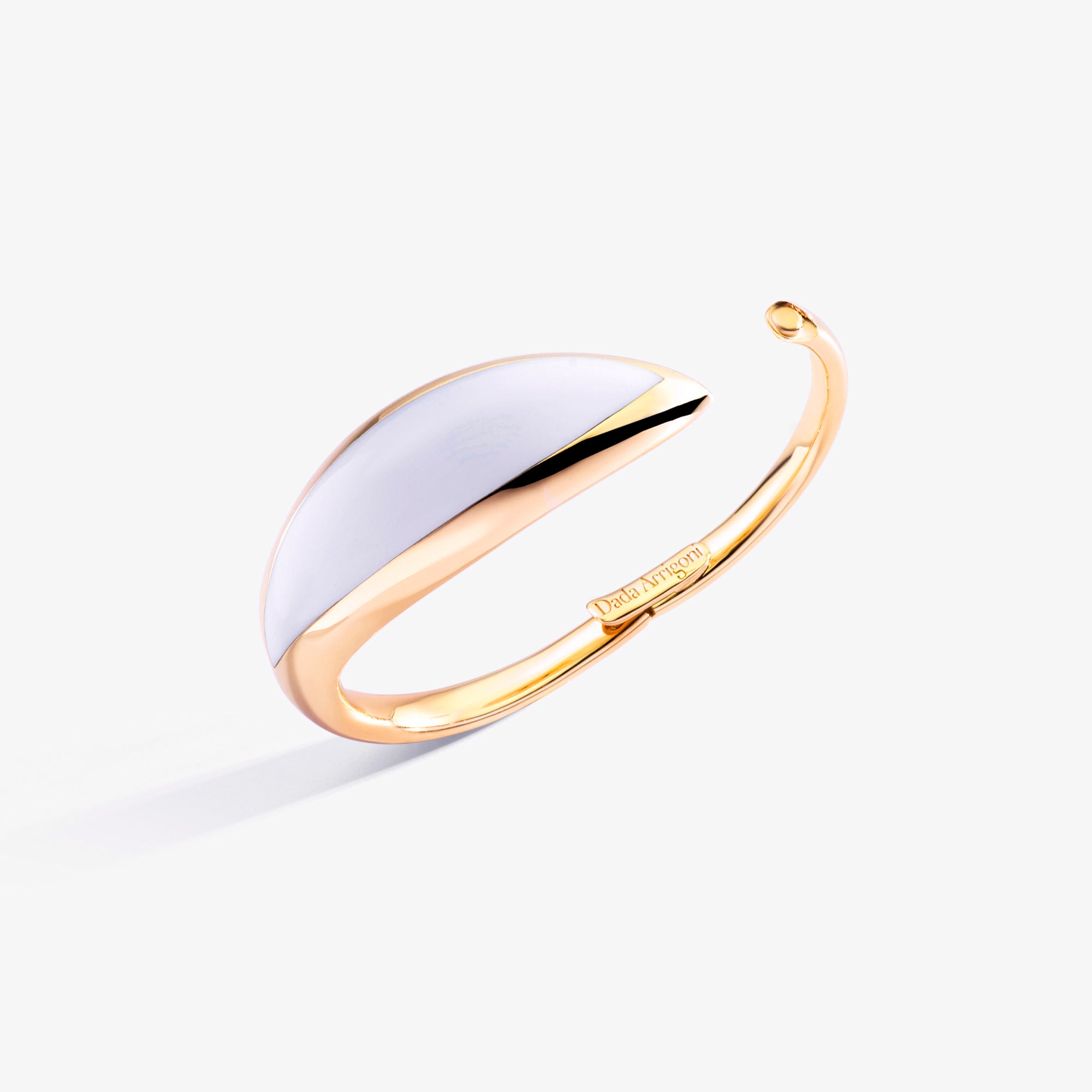 Gold and stone blend in perfect harmony, creating a bangle with a sculptural design. The sinuous lines embrace the wrist with natural elegance, while the metallic sheen enhances the stone's reflections. A central hinge closure ensures secure comfort. A bold and sophisticated piece, pure emotion to wear.