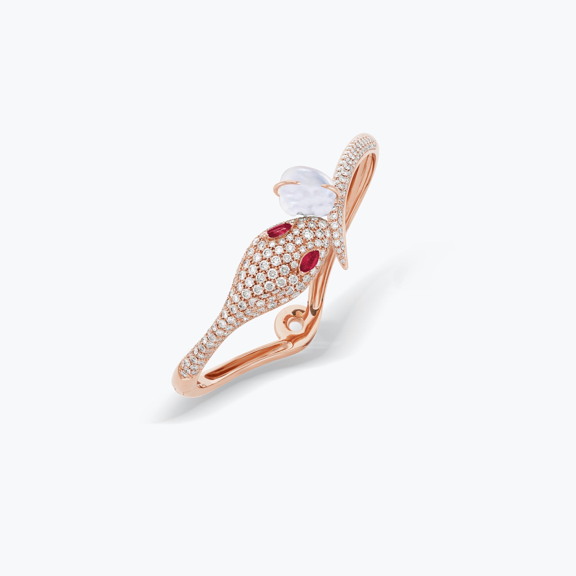 Bangle bracelet from the Malafemmina collection with a melina sculpted from natural stone. The snake's head and tail are embellished with pavé diamonds, while the eyes are navettes set with precious stones. The side hinge allows for a practical and refined opening. A piece of jewelry that combines elegance, mystery, and character.