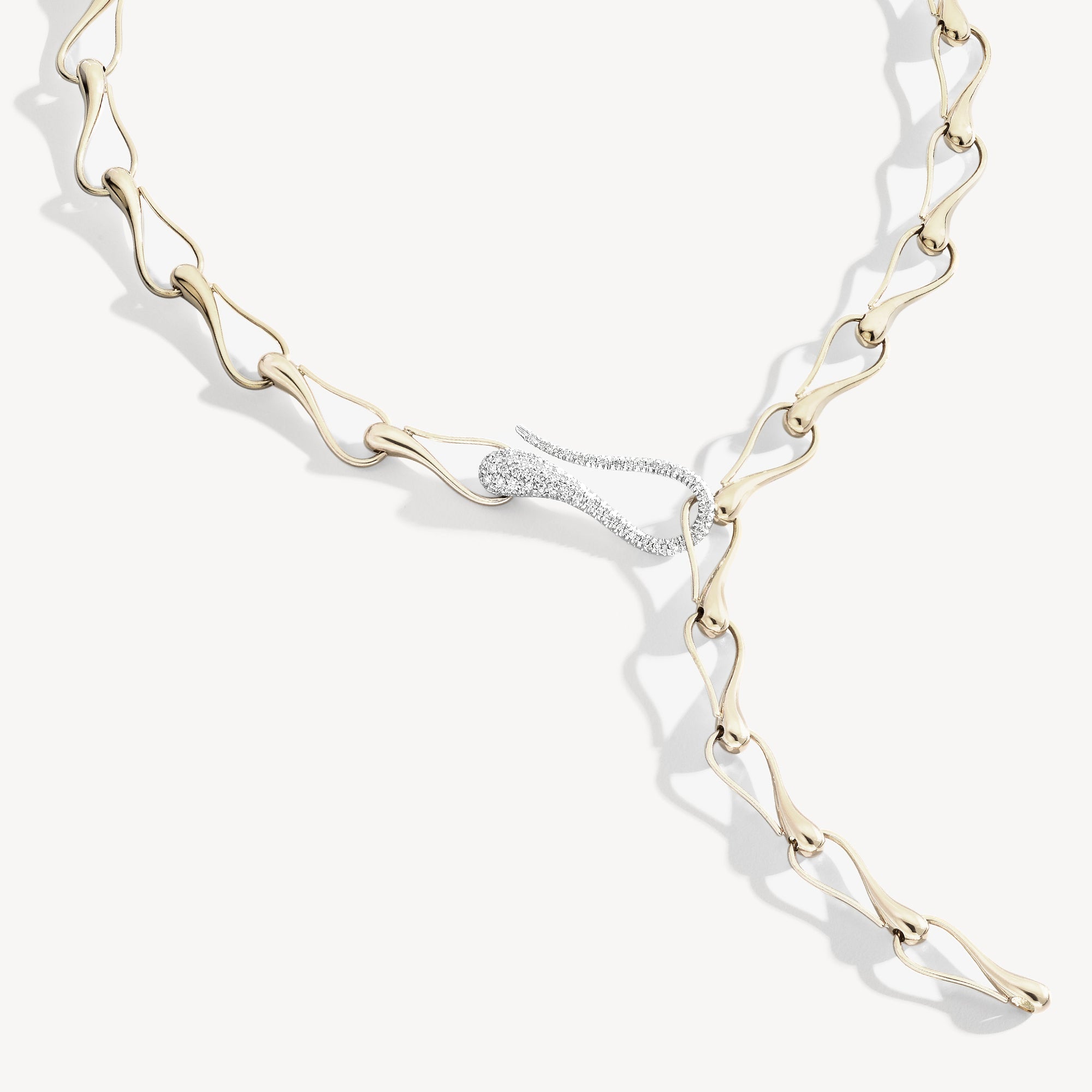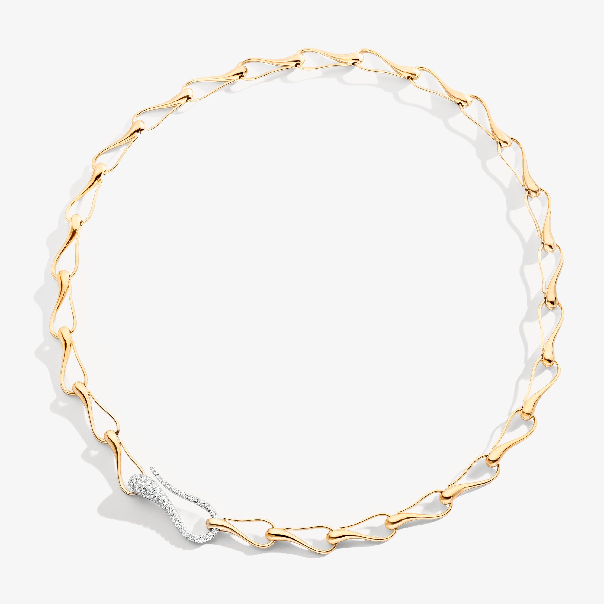 An iconic chain from the Elika collection, crafted with a lightweight and dynamic module inspired by the spiraling flight of a maple seed. Each element harmoniously blends into a sculptural and airy structure. The design, linear yet visually powerful, finds new expression in a central element set with diamond pavé. The invisible clasp, integrated into one of the modules, maintains the continuity of the movement. A transformable jewel, a symbol of balance between elegance and structure.