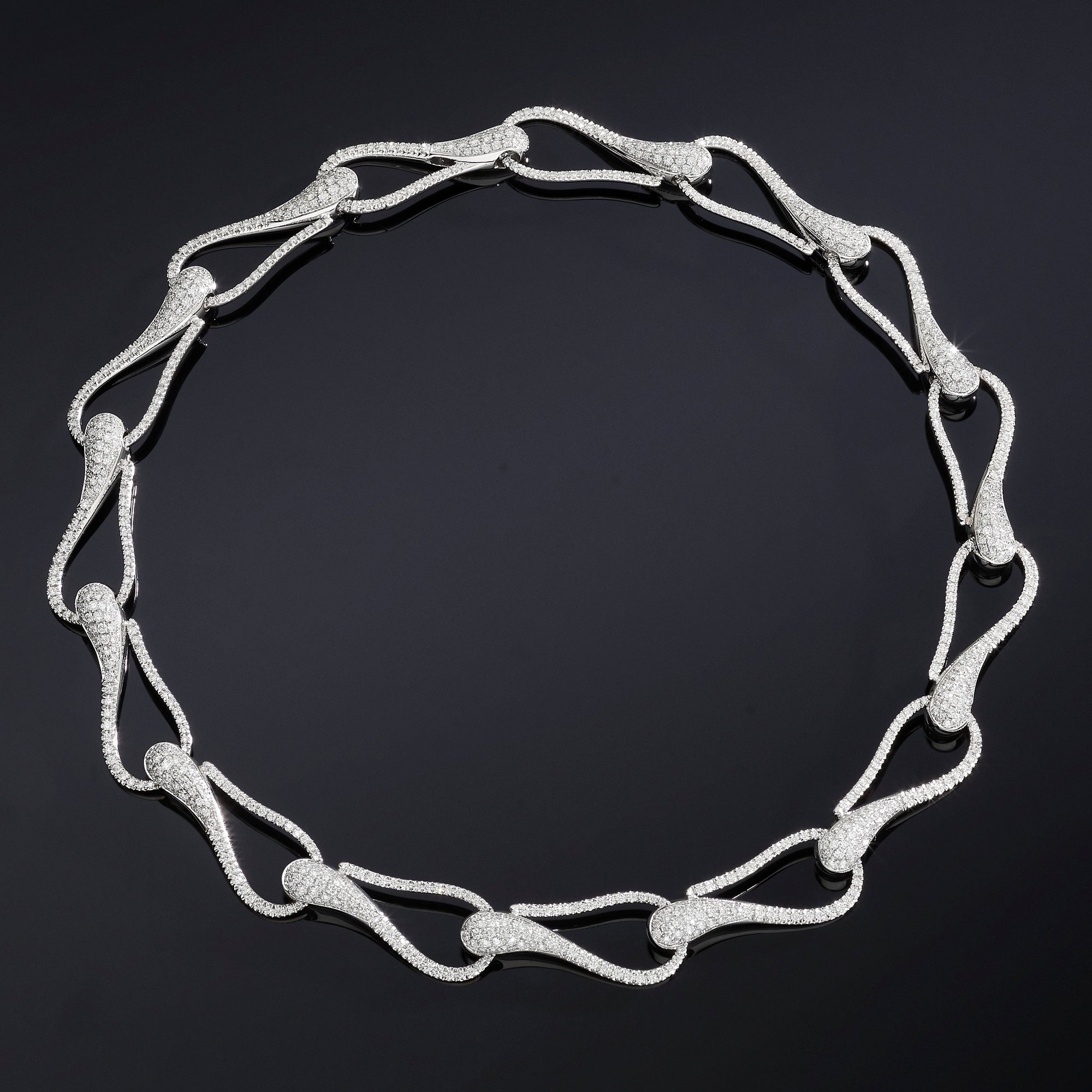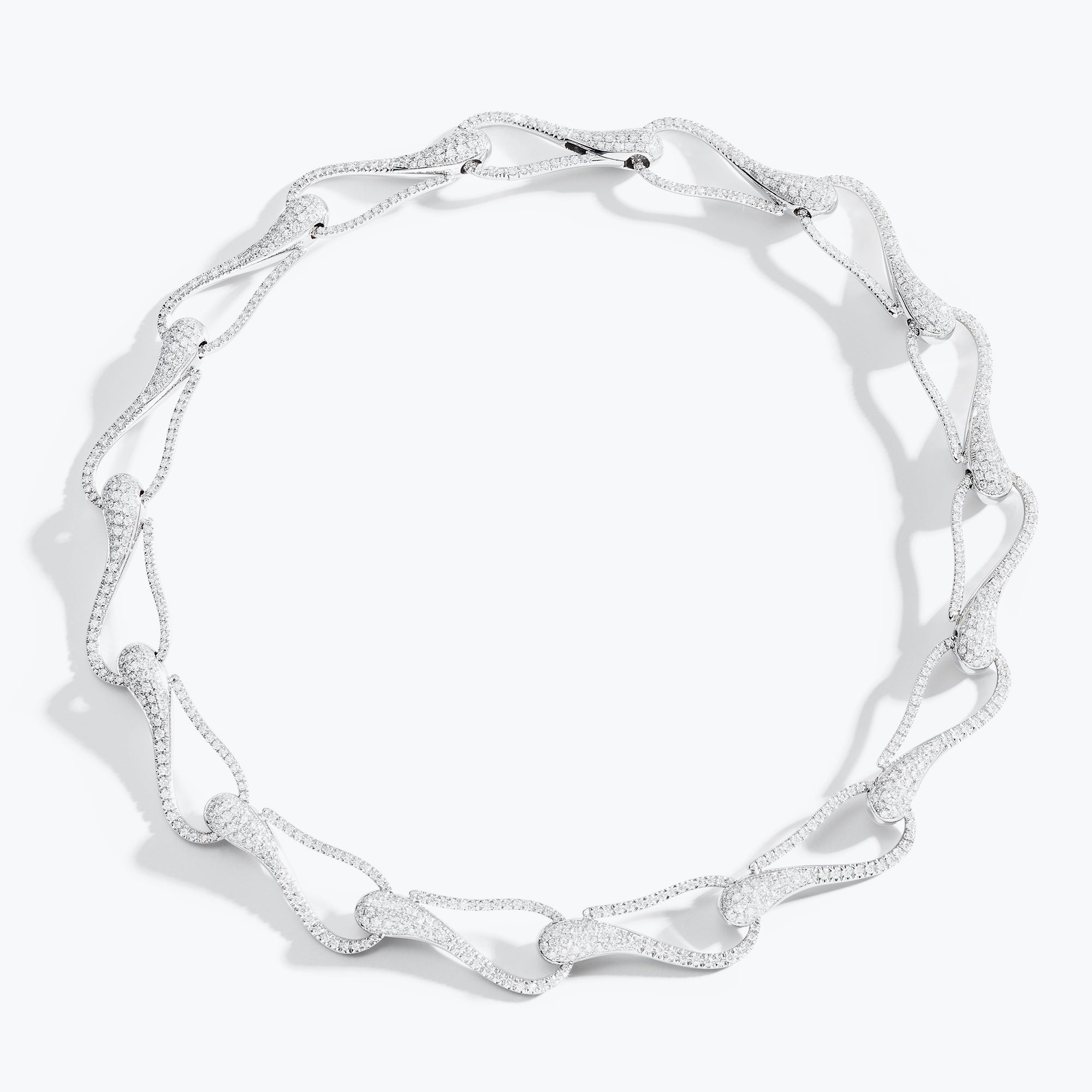The most precious version of the Elika collection, this choker is composed of modules inspired by the helical flight of maple seeds, entirely covered in diamond pavé. A powerful, sculptural line that envelops the neck with absolute elegance. The invisible clasp preserves the fluidity of movement. A fine jewelry piece, essential in form and magnetic in presence.