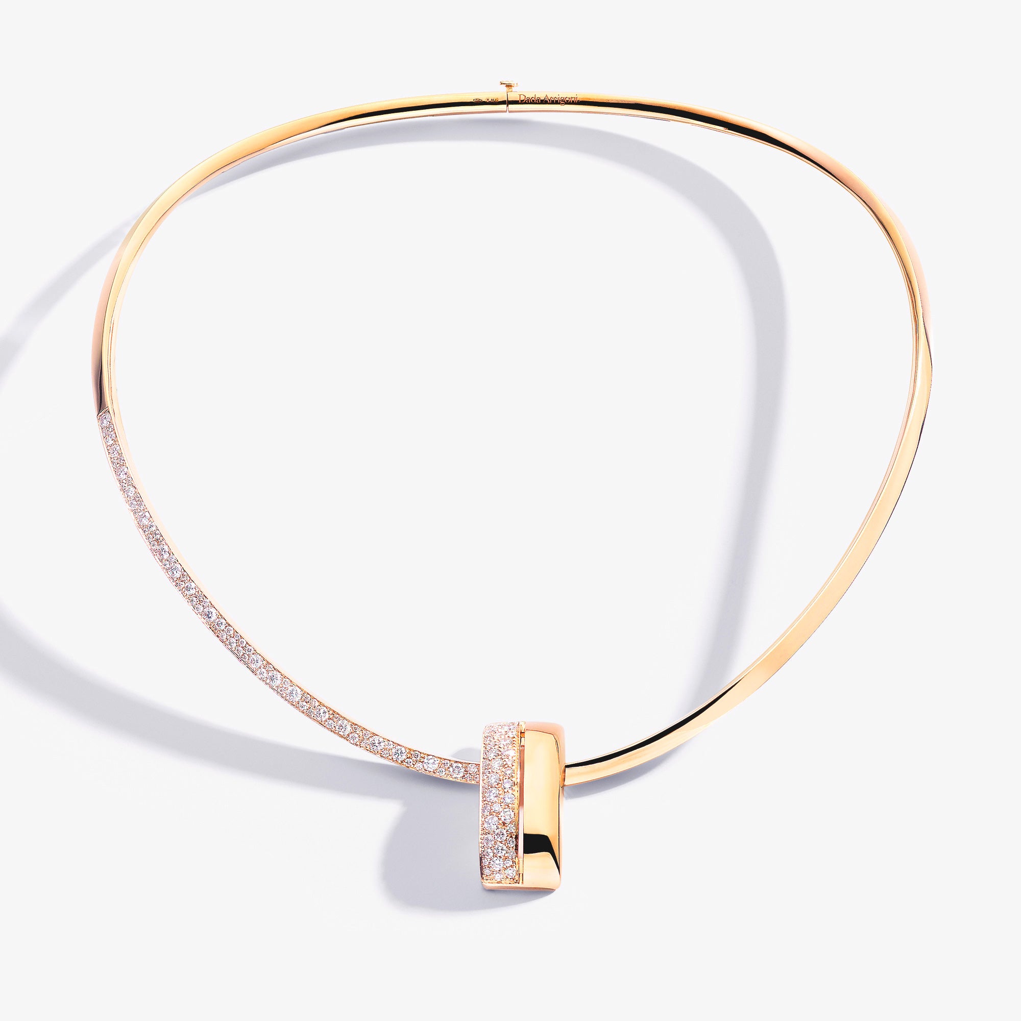 Ergonomic, perfectly fitting rigid necklace, half in 18k gold and half in pavé diamonds, with a central articulated element in gold and diamonds, divided by a line, an empty space, that creates a vibrant contrast. Concealed drawer closure.