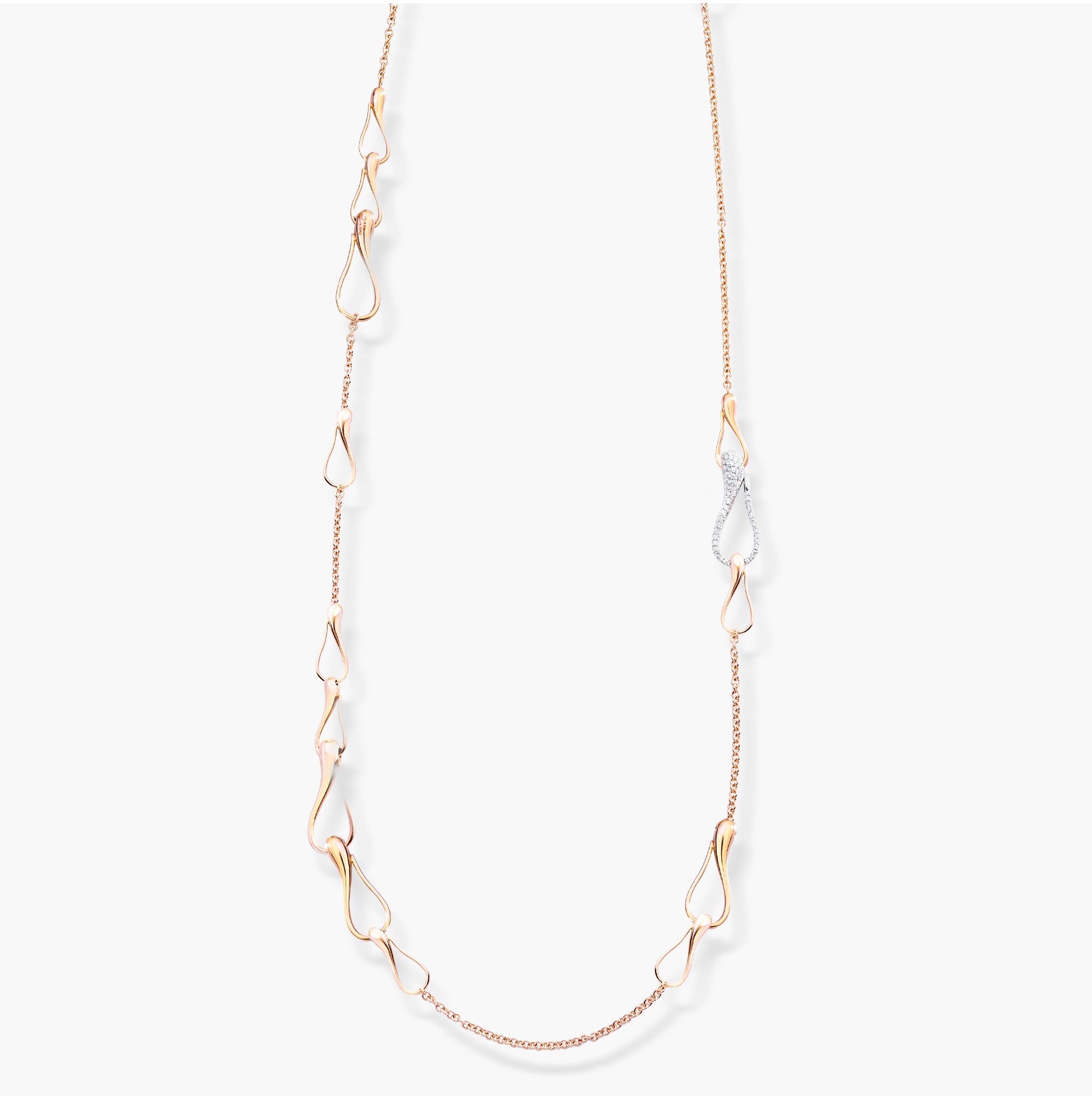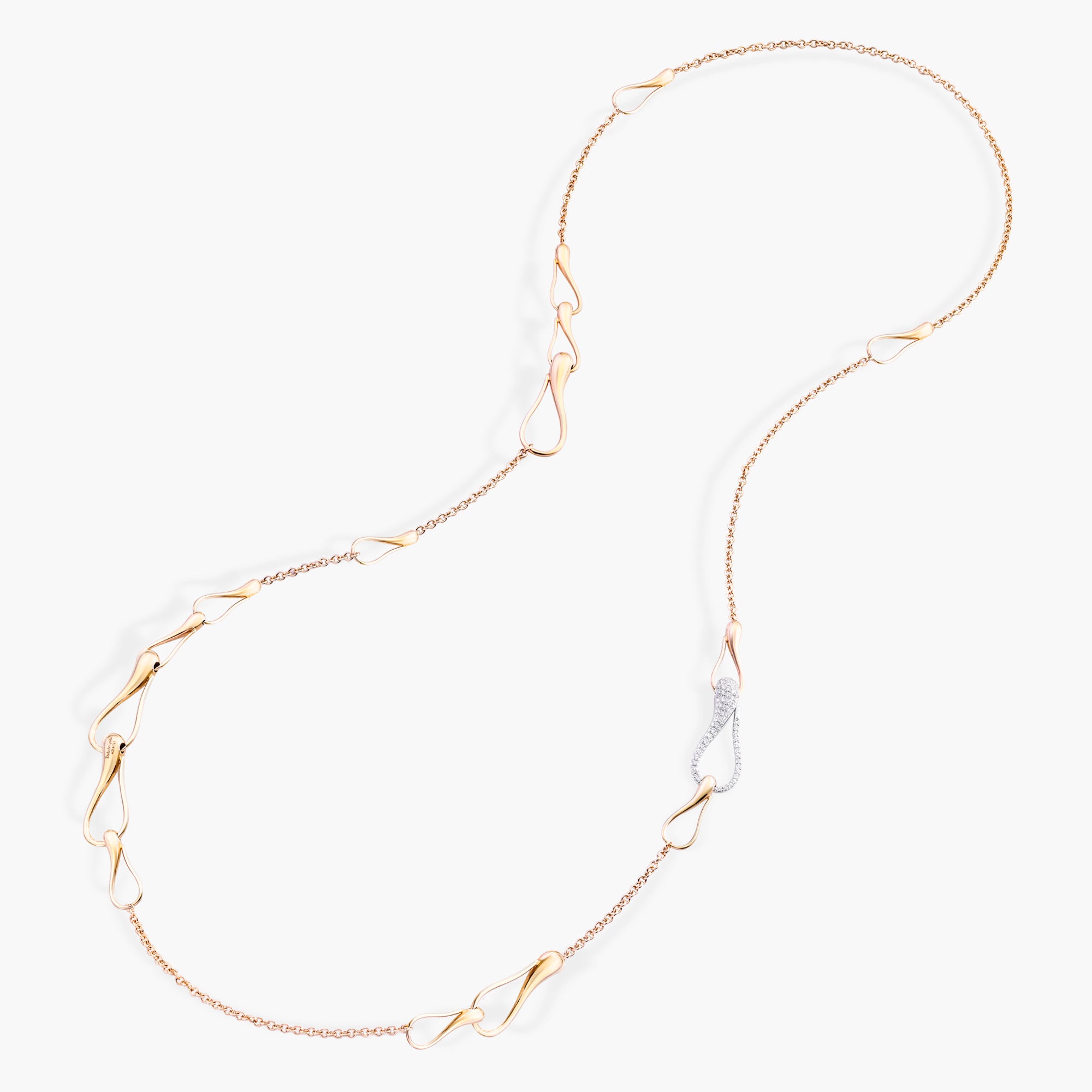 The Elika design, inspired by the spiraling flight of a maple seed, gives life to a light and sculptural sautoir necklace. The modular structure allows for multiple configurations, assembled with a simple gesture. A module paved with diamonds on both sides introduces a precious sparkle, while the invisible clasp maintains the fluidity of movement. A transformable jewel, designed to freely adapt to the body and style.