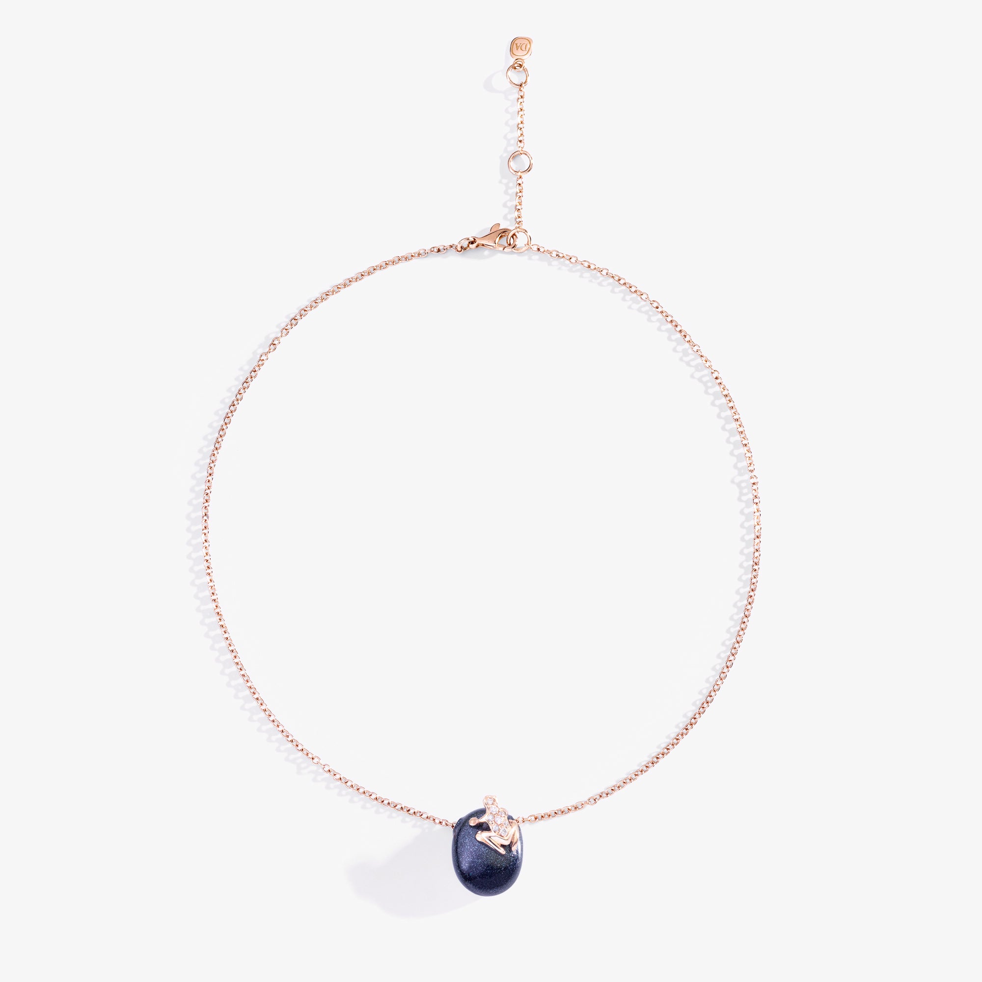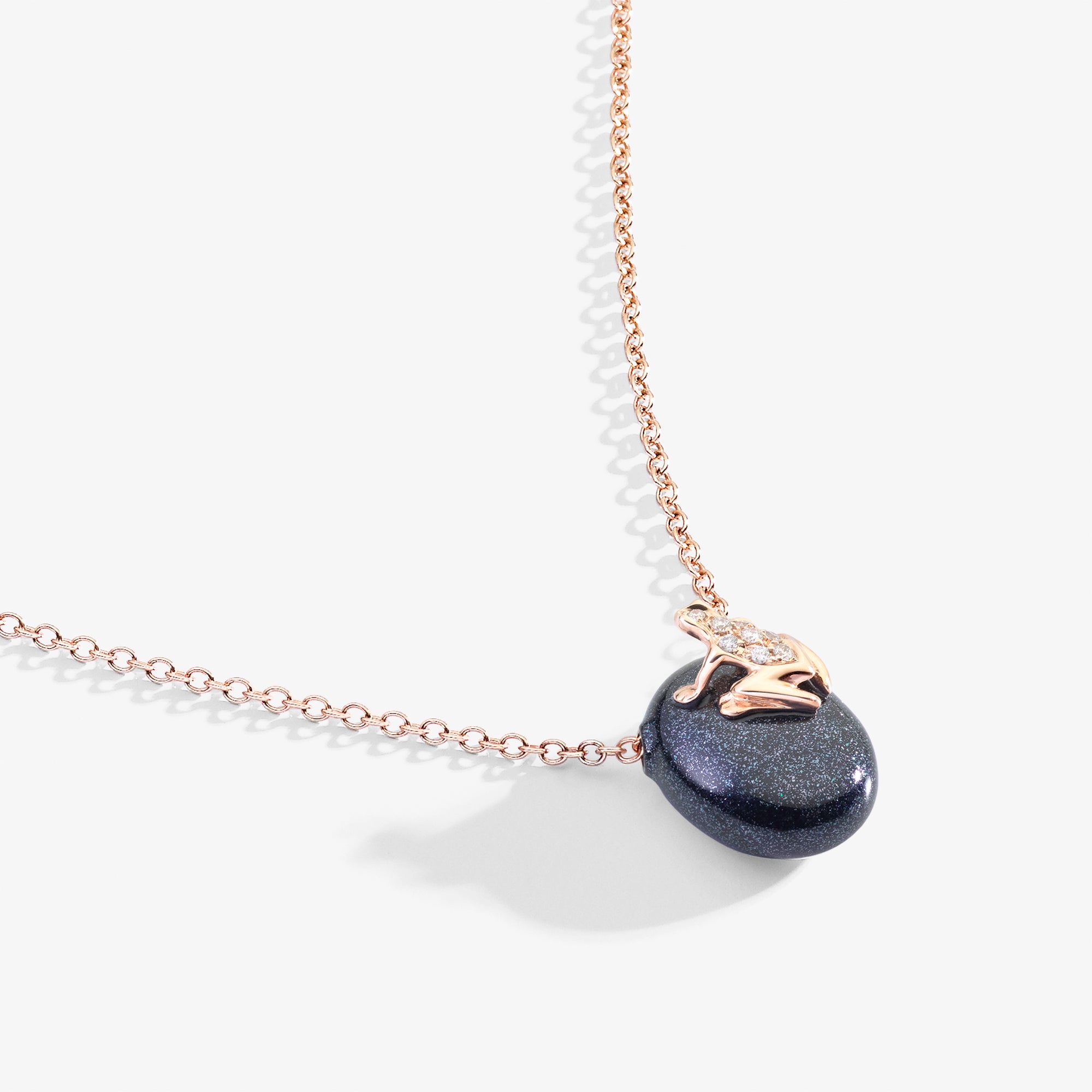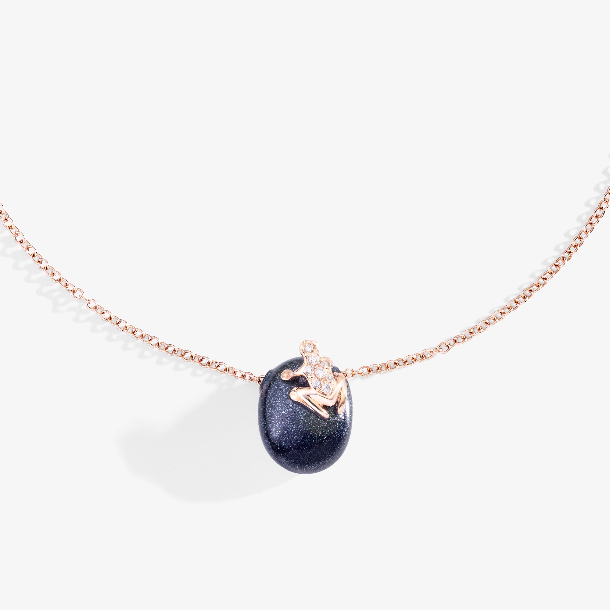 A simple and ironic necklace: the gold chain features a polished colored nugget, atop which sits the iconic gold and gemstone frog. A light, joyful, and meaningful talisman. The color is achieved by hand painting. Any imperfections are a testament to this craftsmanship. The color is weather-resistant but not scratch-resistant. The lobster clasp can be attached to multiple jump rings to adjust the length.