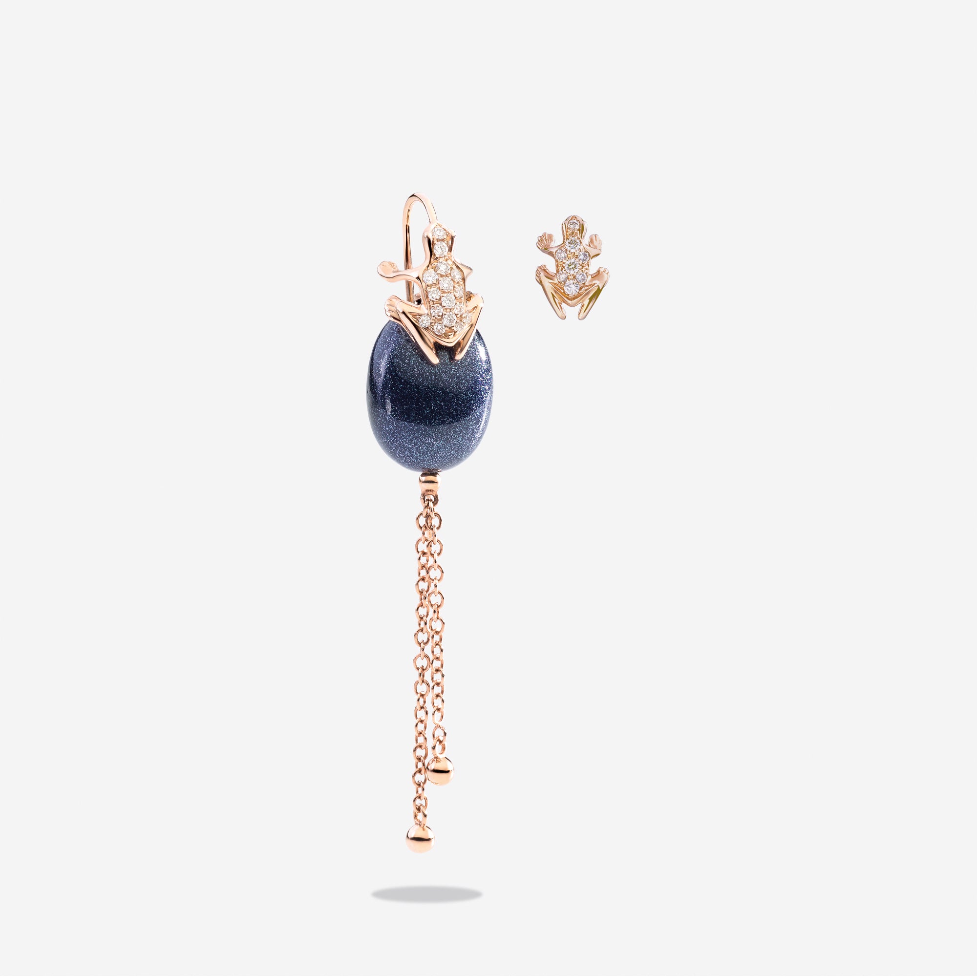 These asymmetrical Happy Frog earrings feature an unexpected design: the pendant features a colorful nugget on which the iconic gold and gemstone frog climbs, accompanied by a cascade of moving chains. The second earring, a lobe, features a mini version of the frog. The color is achieved through hand painting. Any imperfections are a testament to this craftsmanship. The color is weather-resistant but not scratch-resistant. The pendant features a hook closure and a stud closure for the lobe.
