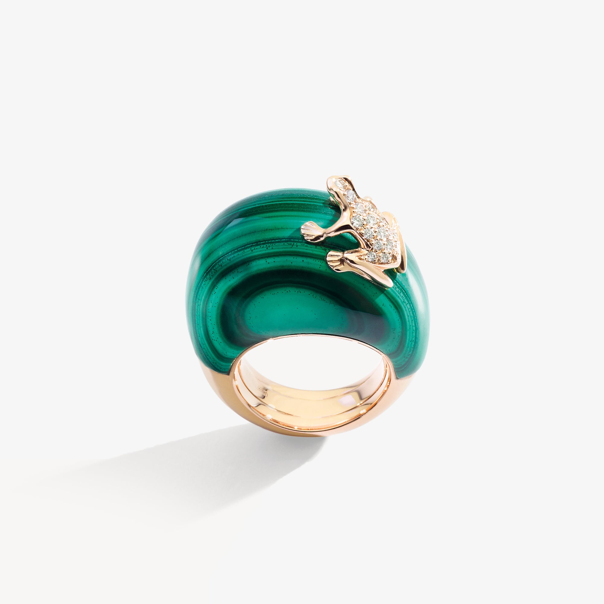 The iconic sculpture ring from the Happy Frog collection is dressed in material: the upper part is carved from semiprecious stone, upon which the gold and diamond frog perches. The rest of the ring's shape is 18k gold. A tactile micro-architecture that combines art and irony. The internal gold spring allows for two adjustable sizes for flexible and comfortable wear.