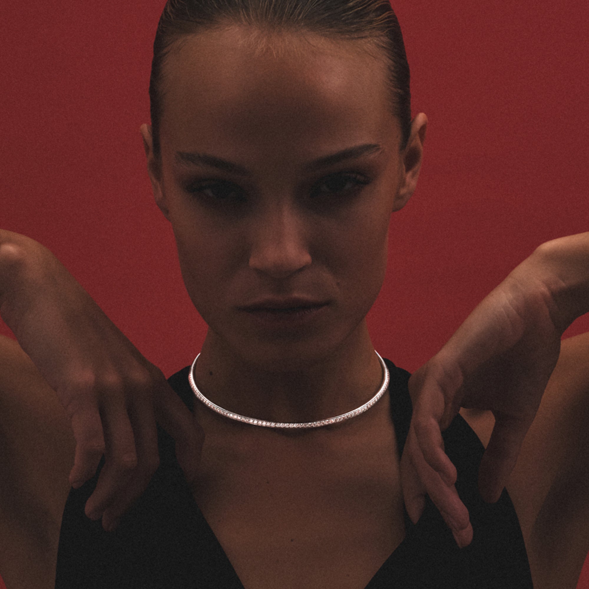Stretch choker with a minimalist design embellished with a pavé of diamonds. It wraps around the neck with flexibility and light, adapting to movement with natural elegance. The adjustable structure ensures comfort and sophistication for every occasion. A contemporary piece that combines bold style and luminous delicacy.