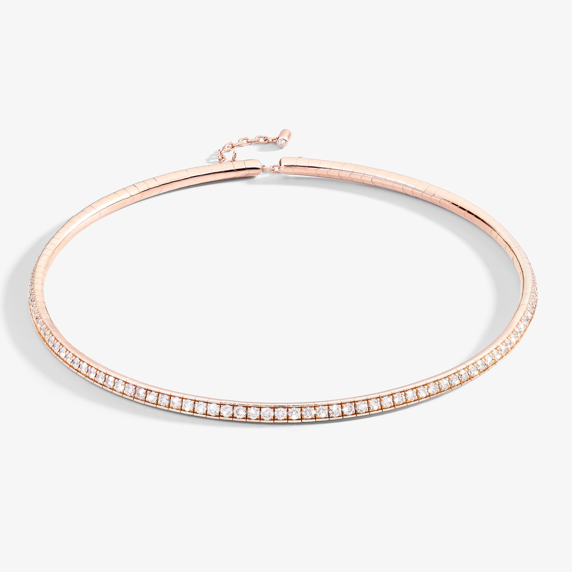 Stretch choker with a minimalist design embellished with a pavé of diamonds. It wraps around the neck with flexibility and light, adapting to movement with natural elegance. The adjustable structure ensures comfort and sophistication for every occasion. A contemporary piece that combines bold style and luminous delicacy.