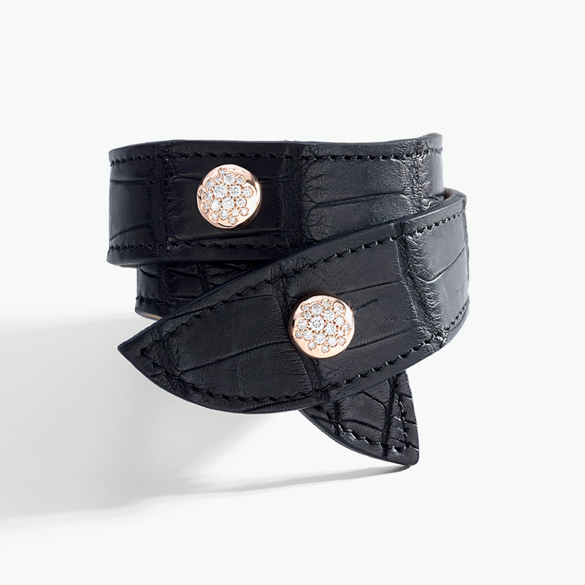 Alligator leather cuff with gold beads embellished with pavé diamonds. The enveloping and bold design embraces the wrist like a stylish suit of armor, blending couture spirit and contemporary strength. An icon of the Glamour collection, it comes with CITES certification for the alligator leather, guaranteeing its legal and traceable origin.