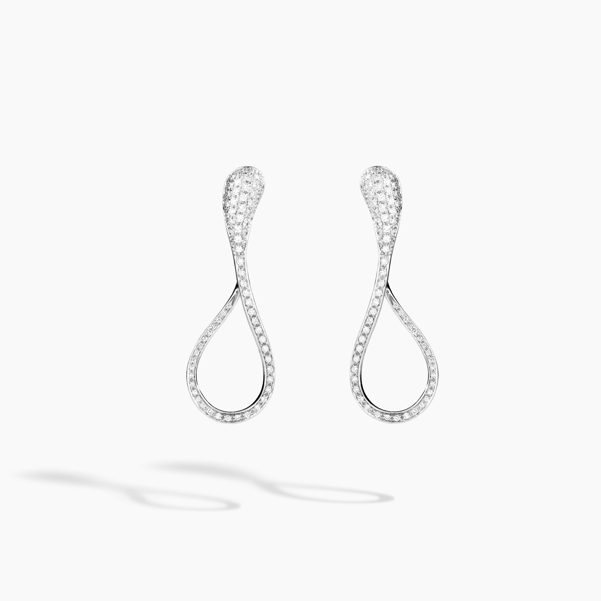 Elika earrings in the medium version, with a module inspired by the spiral flight of a maple seed and entirely covered in pavé diamonds. The 5 cm length outlines the face with a graphic and light line. The integrated and invisible hinged closure makes it simple and flawless to wear. A sculptural and contemporary piece, designed to accompany everyday gestures with preciousness and character.