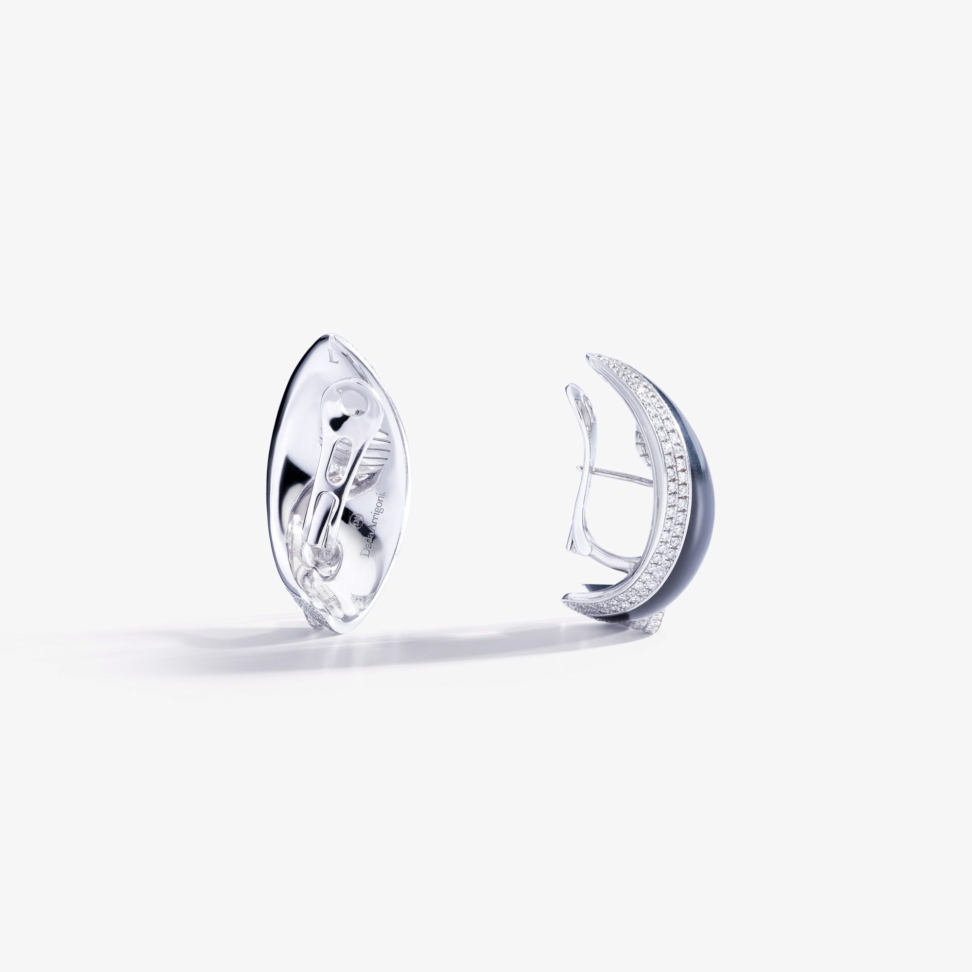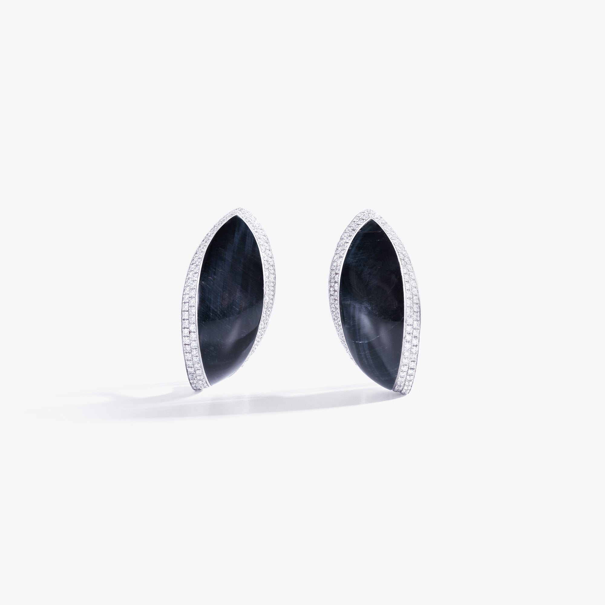 Gold and natural stone blend in a precious embrace, illuminated by a diamond pattern that multiplies reflections and captures the light. The sinuous lines caress the face with natural elegance, transforming the material into a wearable sculpture. Pin and clip closure for perfect comfort. A bold and sophisticated piece, where light becomes emotion.