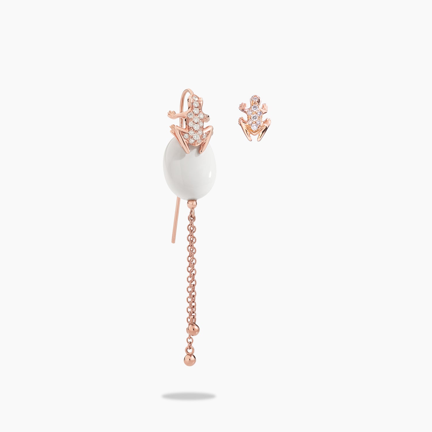 These asymmetrical Happy Frog earrings feature an unexpected design: the pendant features a colorful nugget on which the iconic gold and gemstone frog climbs, accompanied by a cascade of moving chains. The second earring, a lobe, features a mini version of the frog. The color is achieved through hand painting. Any imperfections are a testament to this craftsmanship. The color is weather-resistant but not scratch-resistant. The pendant features a hook closure and a stud closure for the lobe.