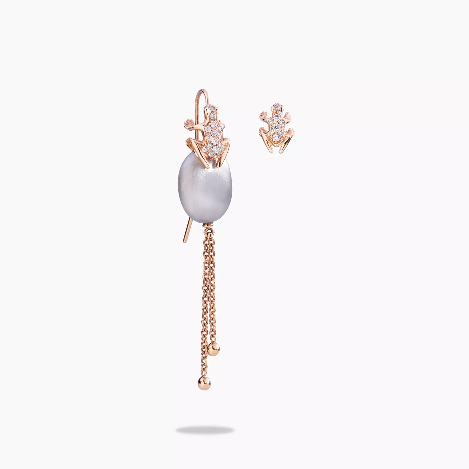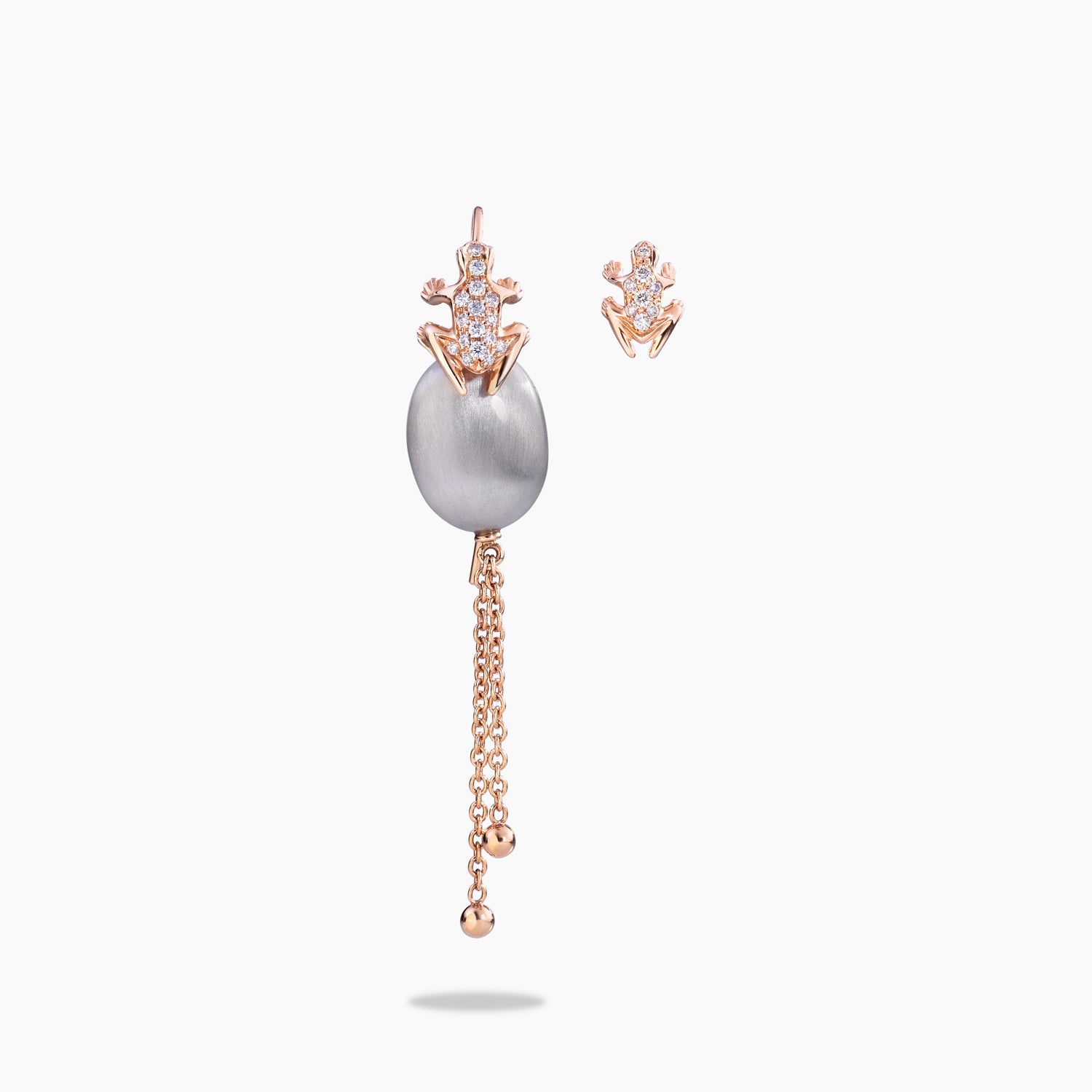 These asymmetrical Happy Frog earrings feature an unexpected design: the pendant features a colorful nugget on which the iconic gold and gemstone frog climbs, accompanied by a cascade of moving chains. The second earring, a lobe, features a mini version of the frog. The color is achieved through hand painting. Any imperfections are a testament to this craftsmanship. The color is weather-resistant but not scratch-resistant. The pendant features a hook closure and a stud closure for the lobe.