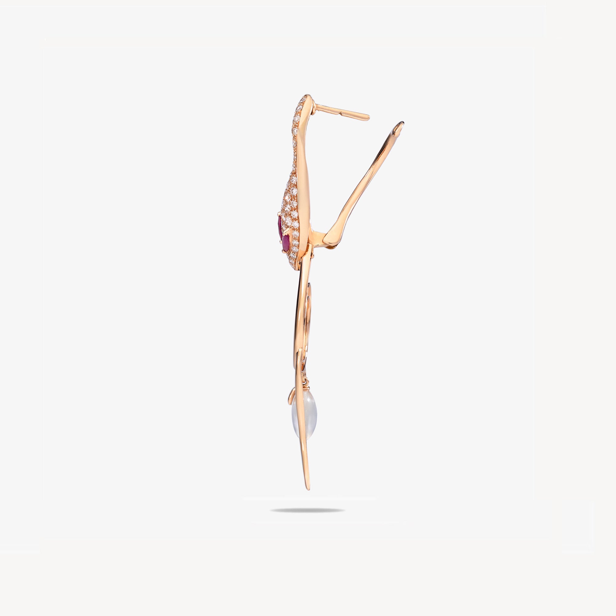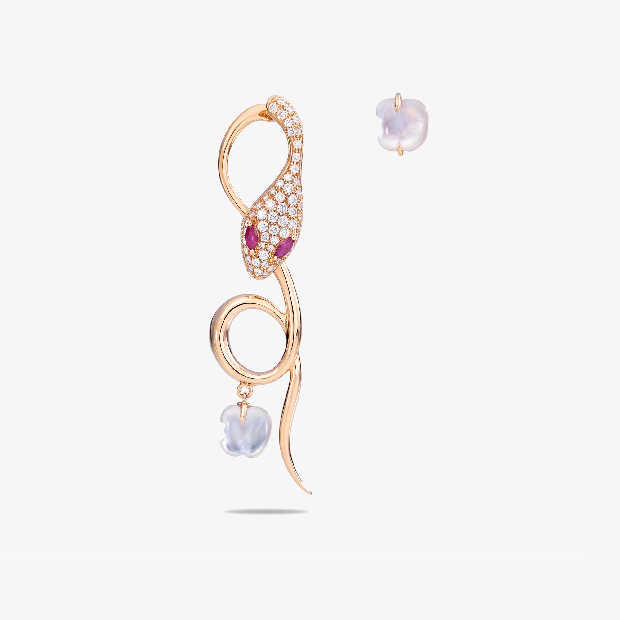 Asymmetric earrings from the Malafemmina collection, featuring a gold snake and a pavé diamond head. The eyes are navettes set with precious stones. A long earring with a natural stone melina pendant pairs with a stone apple stud. A distinctive and sensual design, combining sculpture, symbolism, and irony. A hinged closure for a secure and comfortable fit.