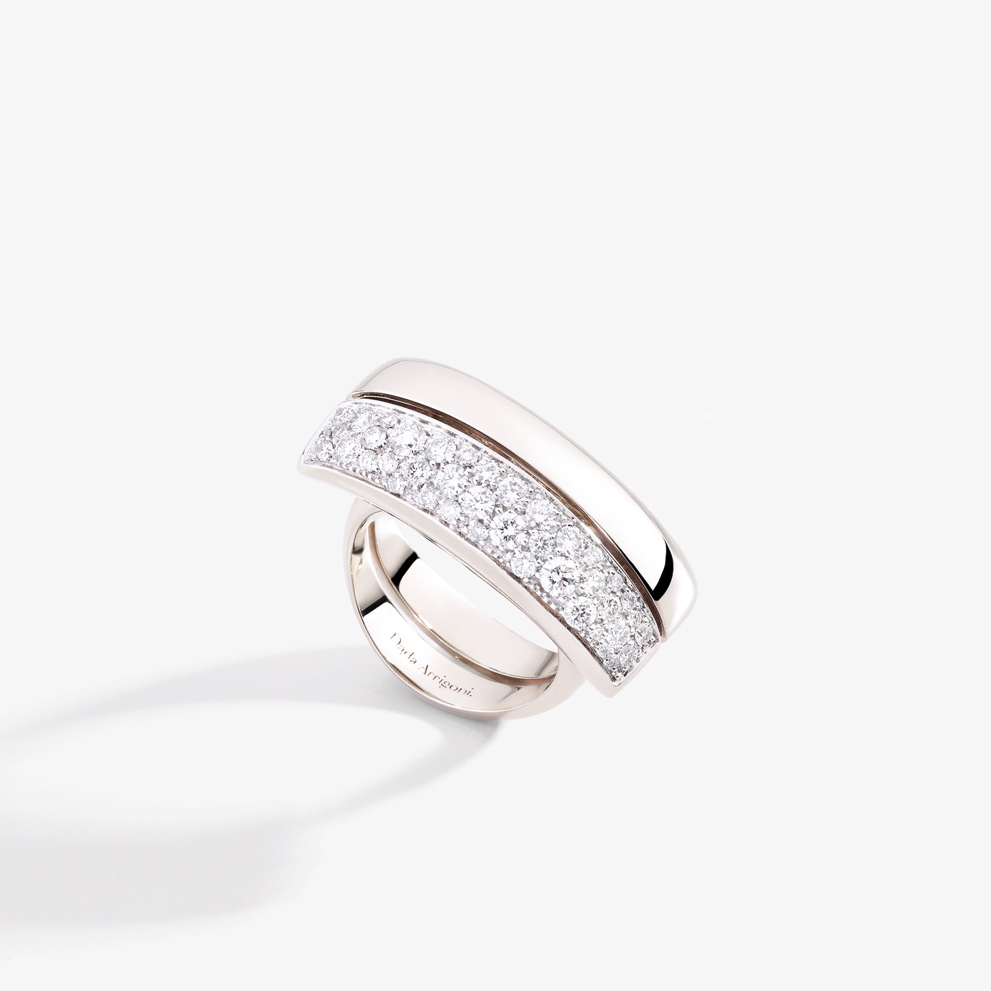 18k gold ring with pavé diamonds. The minimalist geometric shape plays on the clear separation between the gold and diamonds, separated by a line, an empty space, that creates a vibrant contrast and runs the entire length of the piece, including the ring's shank.
