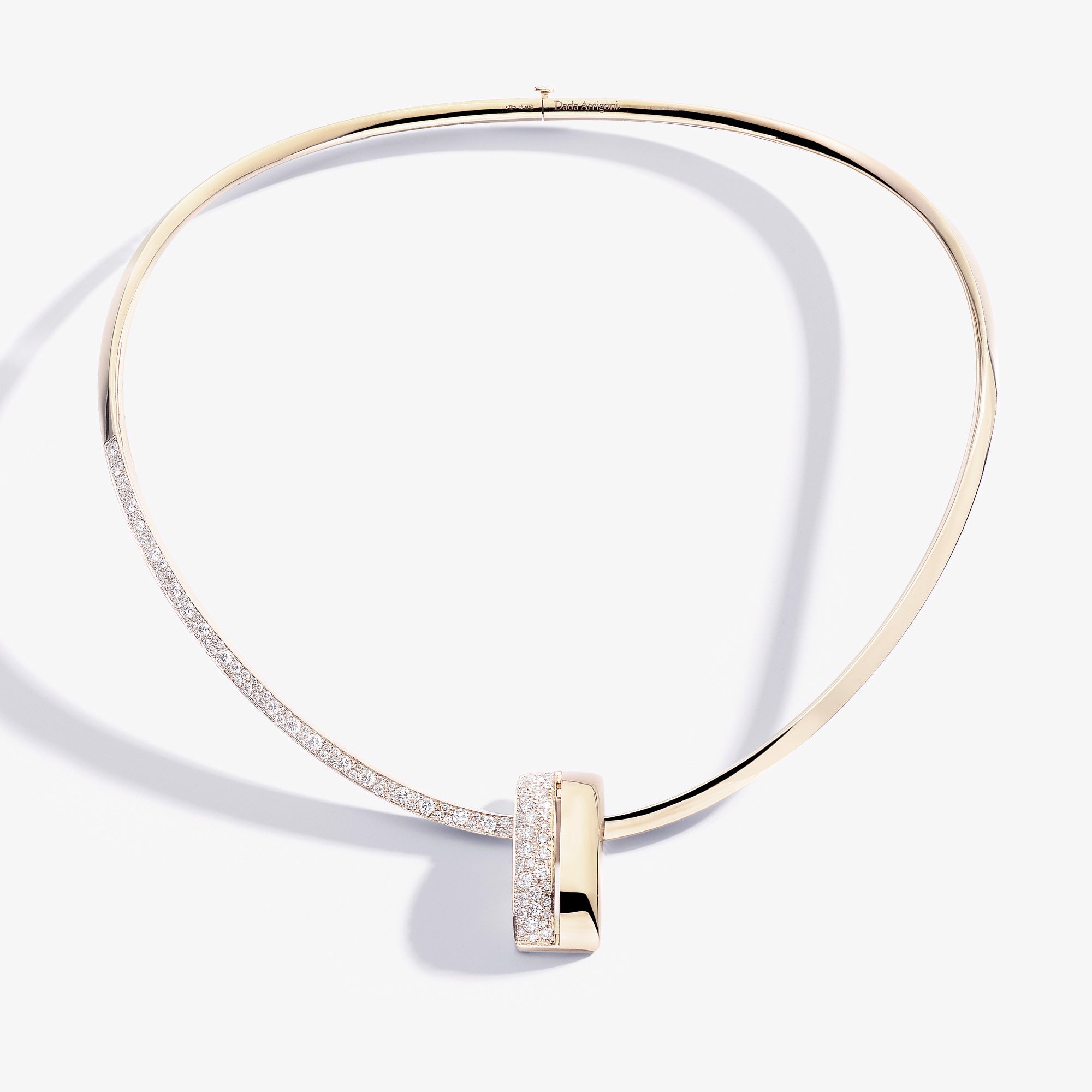 Ergonomic, perfectly fitting rigid necklace, half in 18k gold and half in pavé diamonds, with a central articulated element in gold and diamonds, divided by a line, an empty space, that creates a vibrant contrast. Concealed drawer closure.
