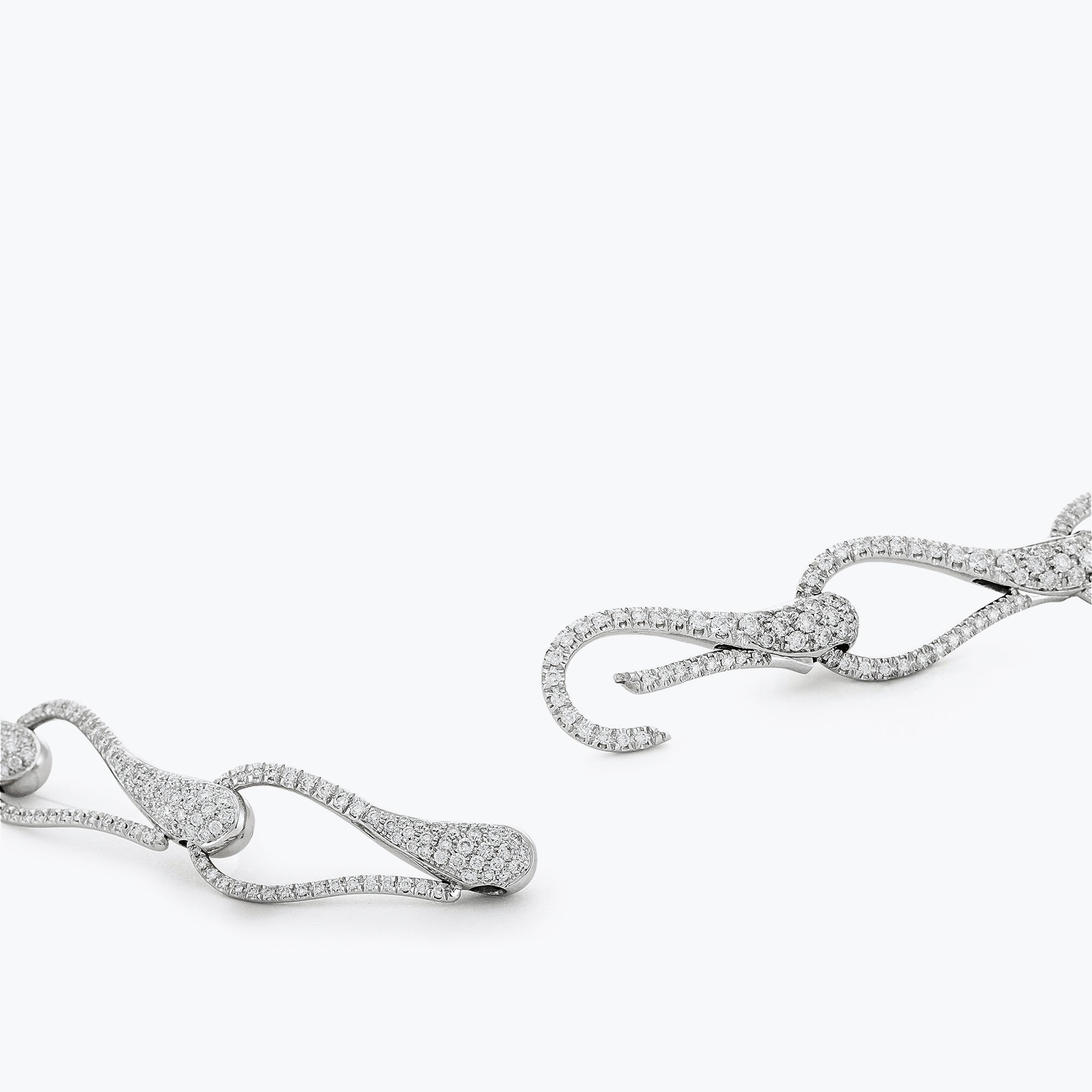 Bracciale Elika composto dalla ripetizione del modulo iconico, ispirato al volo elicoidale del seme dell’acero. Ogni elemento è interamente rivestito da pavé di diamanti, per un effetto di luce profonda, continua e vibrante. Il design scultoreo e fluido è completato da una chiusura invisibile, integrata in uno dei moduli. Può essere agganciato alla catena Elika per creare un gioiello scenografico, perfetto per un’occasione importante.