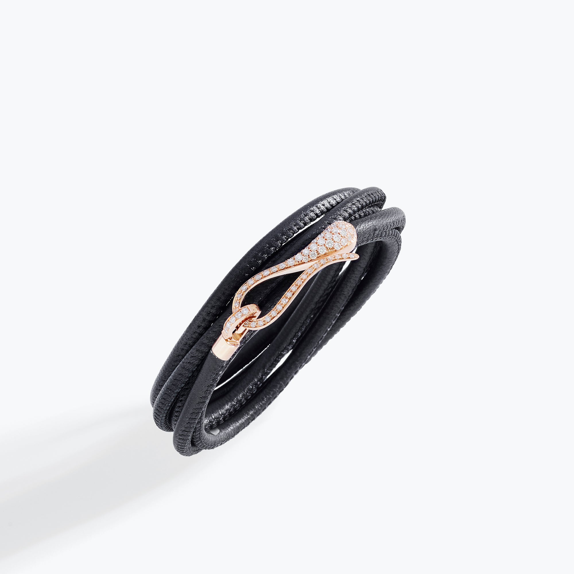 Il bracciale Elika in pelle unisce design iconico e leggerezza contemporanea. Il modulo Elika, ispirato al volo del seme d’acero, si posa su un morbido laccio in pelle nera che avvolge il polso con eleganza. Il pavé di diamanti illumina le forme fluide, mentre la chiusura invisibile garantisce comfort e praticità. Un gioiello raffinato e moderno, perfetto per uno stile distintivo e quotidiano.