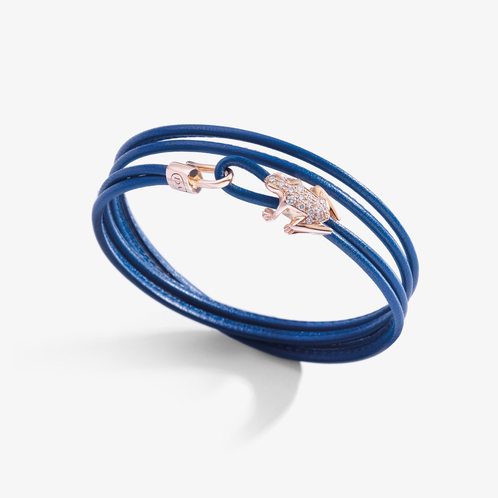 Spirito urbano e anima preziosa: il bracciale Happy Frog avvolge il polso con un doppio giro in pelle di vitello, impreziosito dalla rana in oro e pietre preziose. Un talismano contemporaneo, leggero, versatile e unisex, perfetto per look casual o sofisticati. Un gioiello essenziale dal carattere deciso e inconfondibile.