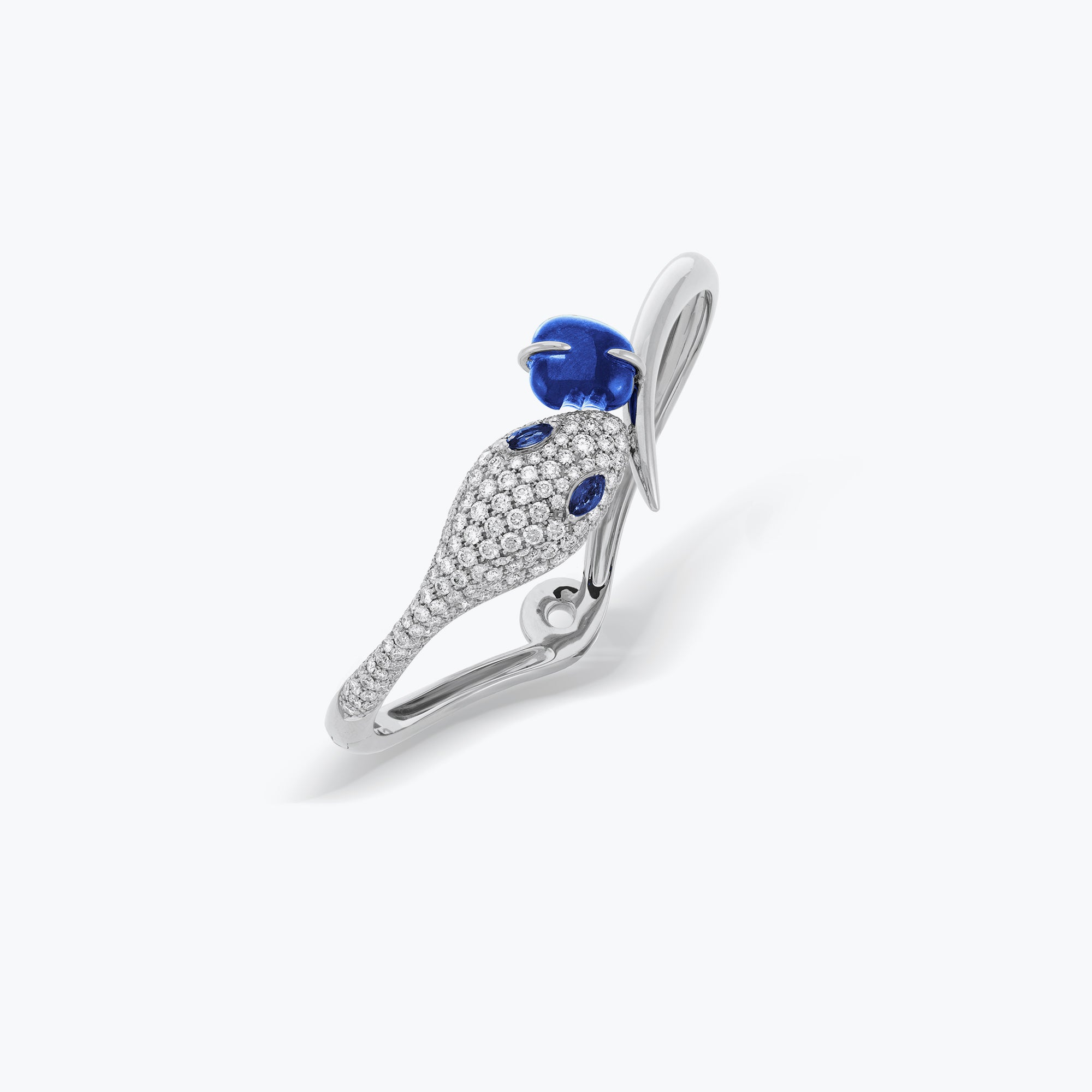 Bracciale rigido della collezione Malafemmina con melina scolpita in pietra naturale e serpente in oro con testa in pavé di diamanti. Gli occhi sono navettes in pietre preziose. La speciale incernieratura laterale ne facilita l’apertura e l’indosso, unendo eleganza e funzionalità. Un gioiello iconico e raffinato, simbolo di forza e seduzione.