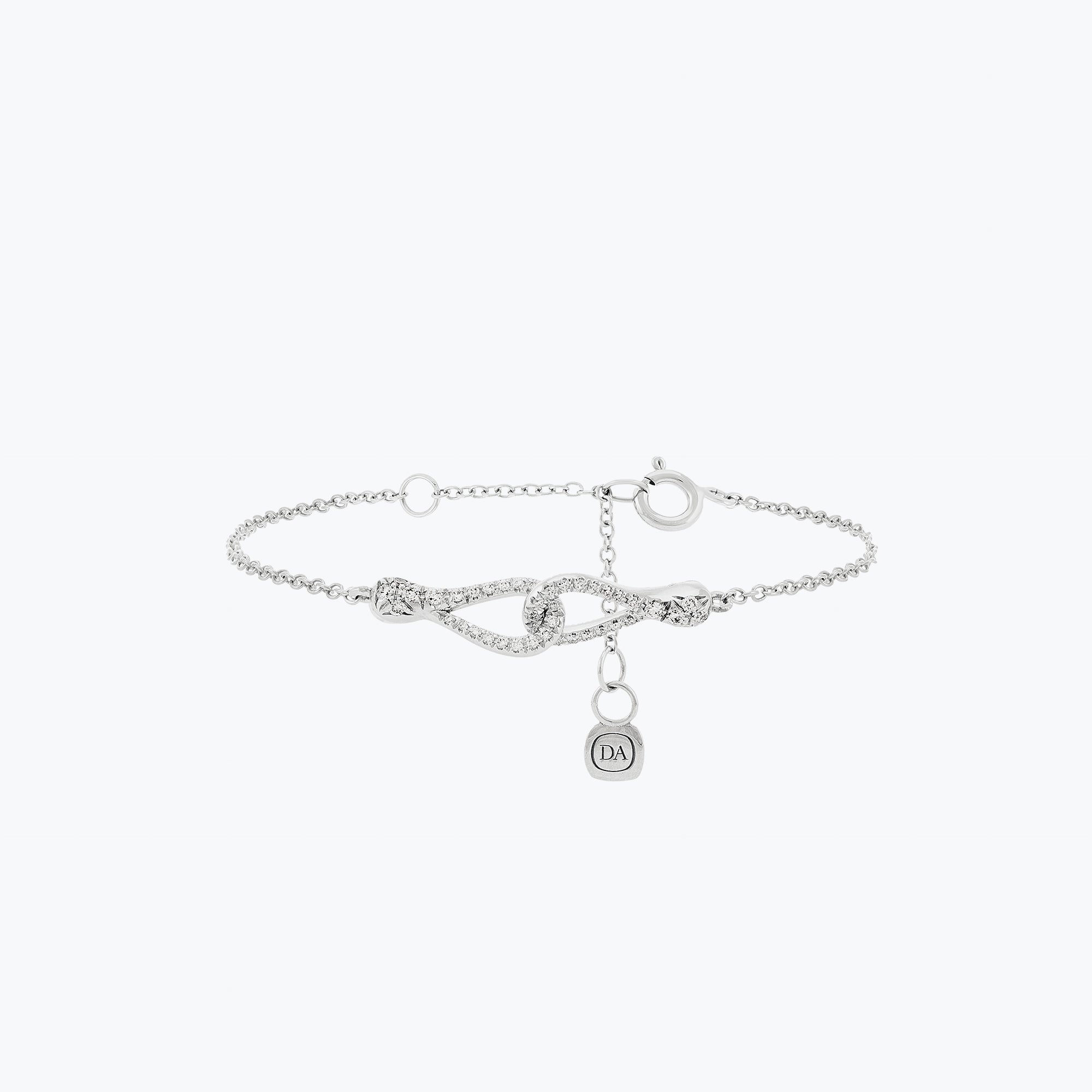 Due moduli Elika Mini da 1,5 cm completamente rivestiti in pavé di diamanti su entrambi i lati si uniscono in una connessione continua, simbolo dell’unione con l’altro. Un segno luminoso ispirato al volo elicoidale del seme d’acero, che celebra l’equilibrio nella coppia. Chiusura con gancio con la possibilità di regolare l’indosso tramite anellini a 13 e 15 cm.