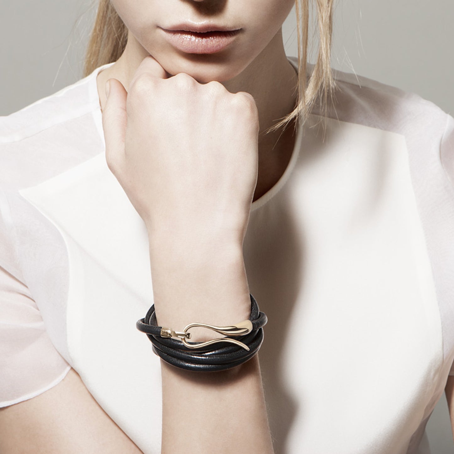 Il modulo iconico Elika, ispirato al volo elicoidale del seme dell’acero, si posa con decisione su un laccio in pelle morbida che avvolge il polso in sei giri eleganti. Realizzato interamente in oro lucido, esprime forza e purezza in un solo gesto. La chiusura laterale, integrata e invisibile, garantisce un’indossabilità fluida e intuitiva. Un bracciale in pelle con dettaglio in oro pensato per chi ama l’eleganza contemporanea e senza tempo.