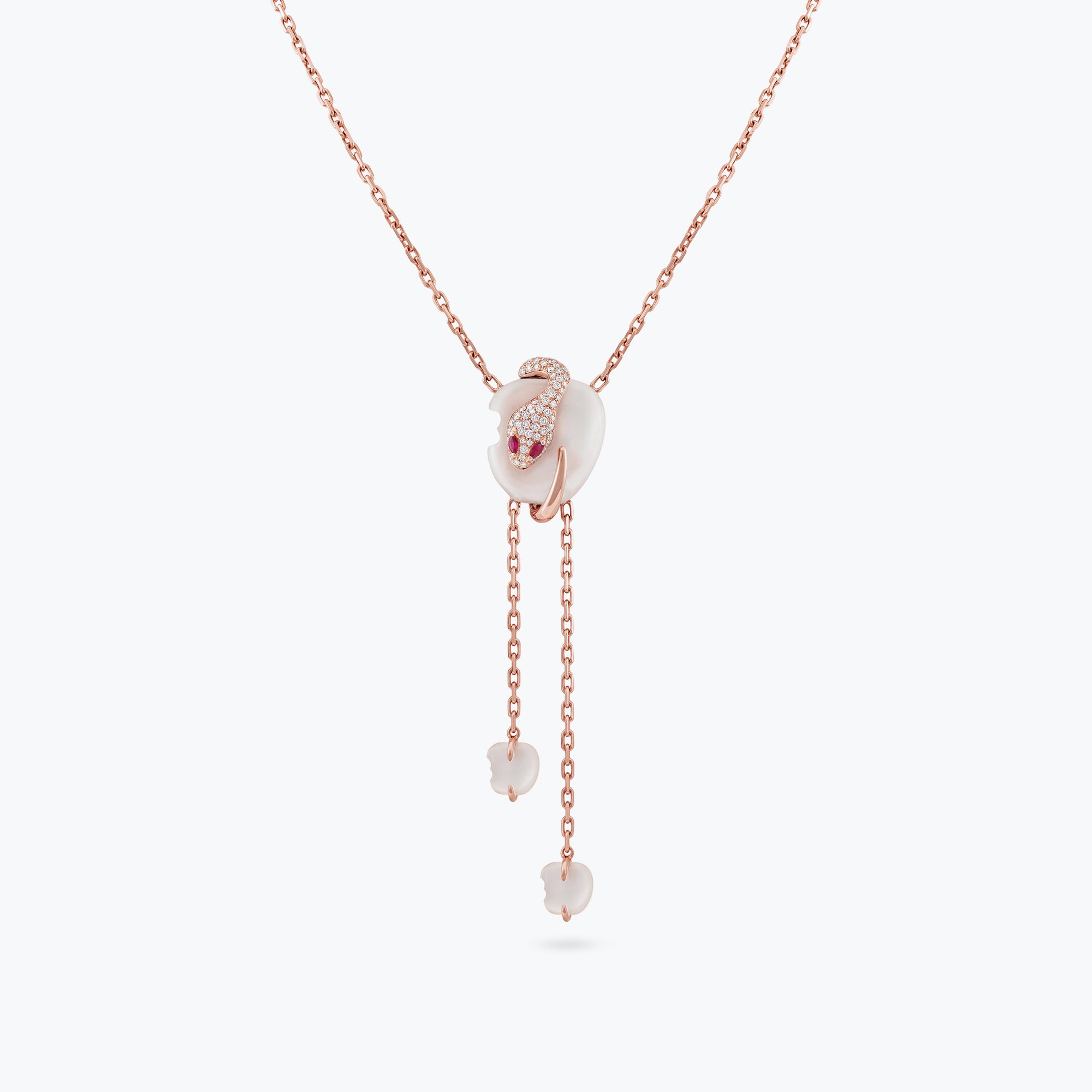 Collana della collezione Malafemmina con mela scolpita in pietra naturale, avvolta da un serpente in oro con testa in pavé di diamanti. Gli occhi del serpente sono navettes in pietre preziose. Completano il design due meline pendenti in pietra naturale. Gli anellini finali permettono di regolare la misura per una vestibilità elegante e versatile.