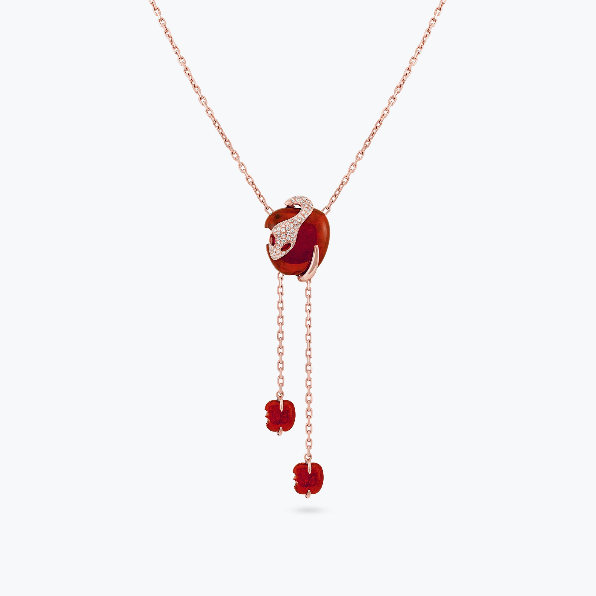 Collana della collezione Malafemmina con mela scolpita in pietra naturale, avvolta da un serpente in oro con testa in pavé di diamanti. Gli occhi del serpente sono navettes in pietre preziose. Completano il design due meline pendenti in pietra naturale. Gli anellini finali permettono di regolare la misura per una vestibilità elegante e versatile.
