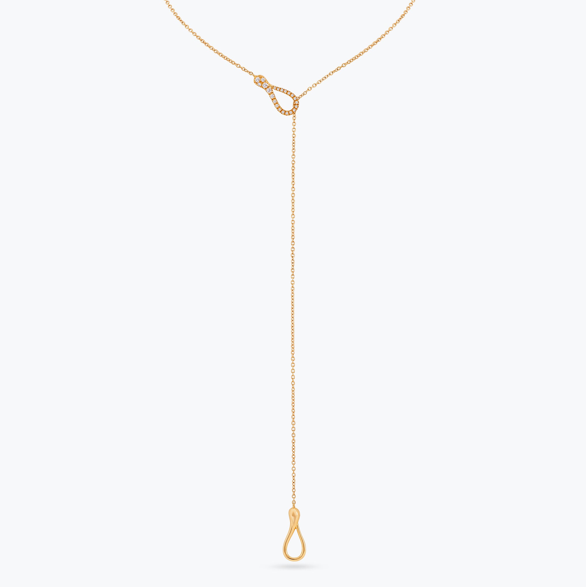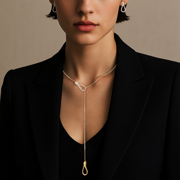 Due moduli Elika Mini, uno in oro lucido e uno in pavé, si dispongono in verticale formando una Y che accompagna il corpo con eleganza. Un equilibrio tra luce e materia, ispirato al volo elicoidale del seme d’acero. Il design, essenziale e grafico, vibra con il movimento naturale di chi lo indossa.