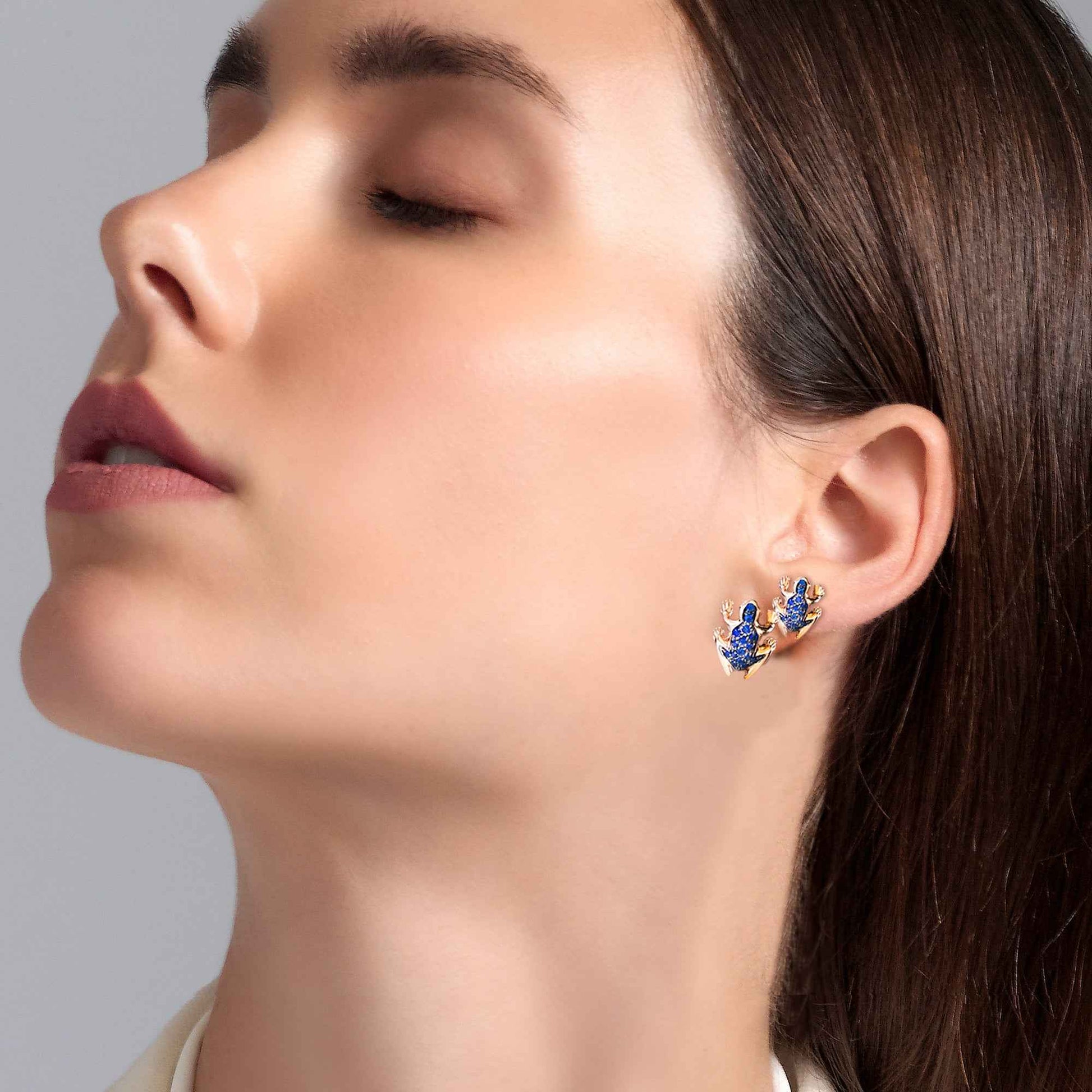 Ironici e delicati, gli orecchini a lobo Mini Frog propongono l’iconica rana Happy Frog in versione mignon. Realizzati in oro e pietre preziose, aggiungono un dettaglio luminoso e giocoso a qualsiasi look. La chiusura è con perno, per un indosso sicuro e leggero. Un piccolo talismano quotidiano, da portare sempre con sé.