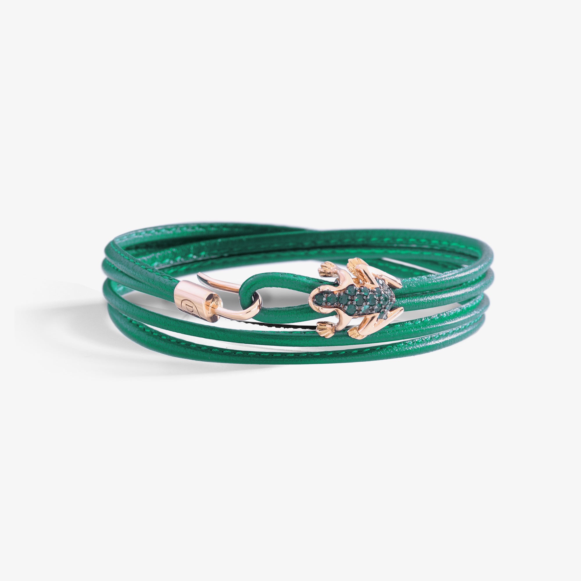 Spirito urbano e anima preziosa: il bracciale Happy Frog avvolge il polso con un doppio giro in pelle di vitello, impreziosito dalla rana in oro e pietre preziose. Un talismano contemporaneo, leggero, versatile e unisex, perfetto per look casual o sofisticati. Un gioiello essenziale dal carattere deciso e inconfondibile.