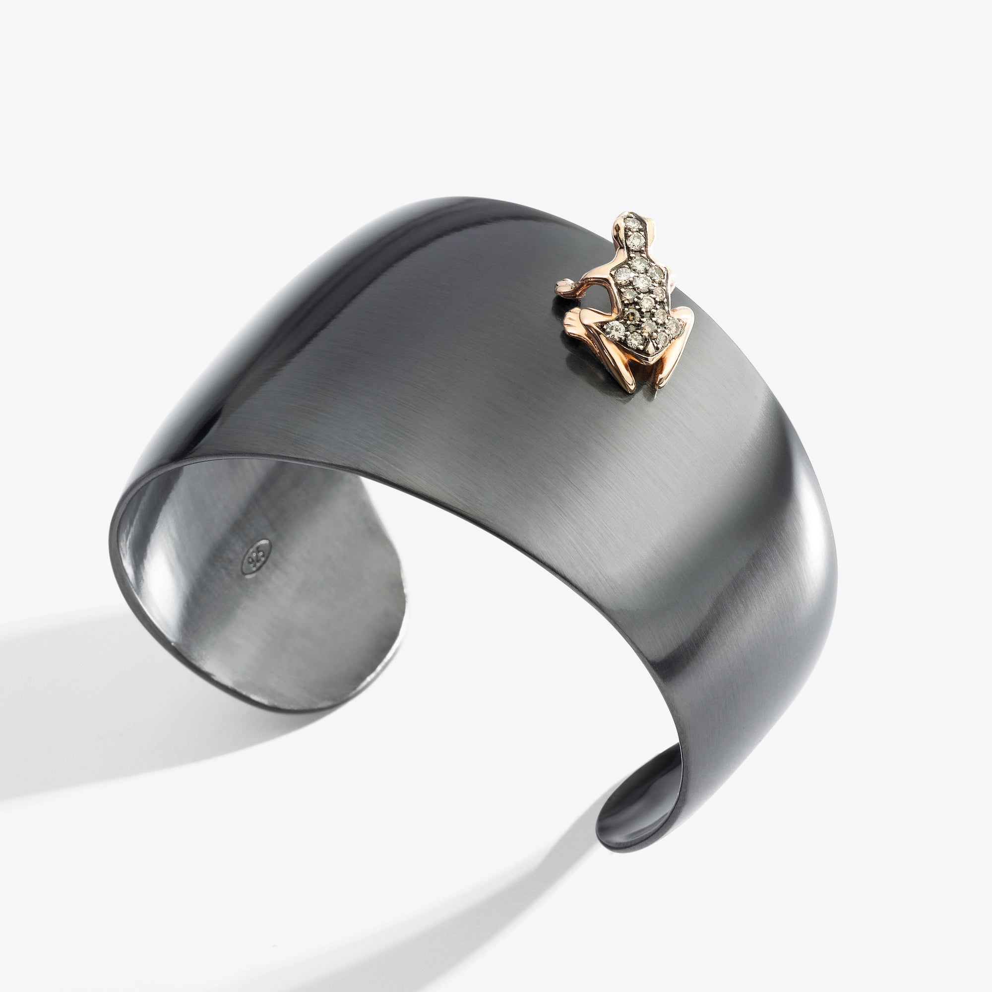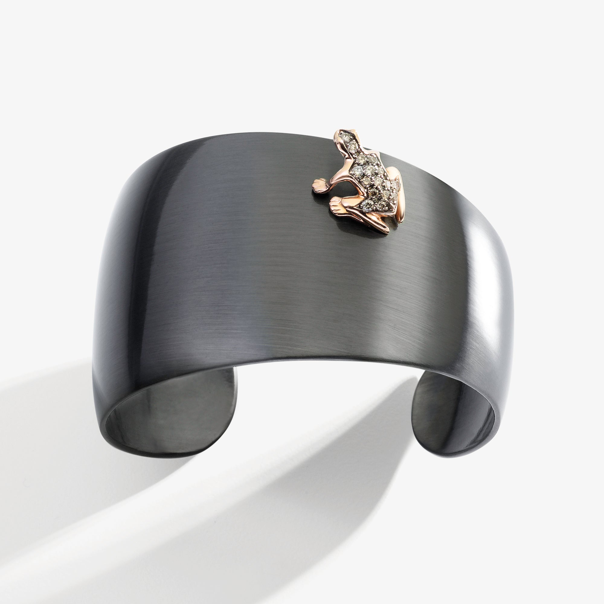 Un colpo di colore al polso: il bracciale Happy Frog Cuff abbina superfici laccate vibranti alla micro-scultura della rana, realizzata in oro e diamanti. Ironico e audace, è un gioiello statement che non passa inosservato. La colorazione è ottenuta tramite verniciatura manuale. Eventuali imperfezioni attestano questa manualità. Resiste agli agenti atmosferici ma non ai graffi e alle botte.