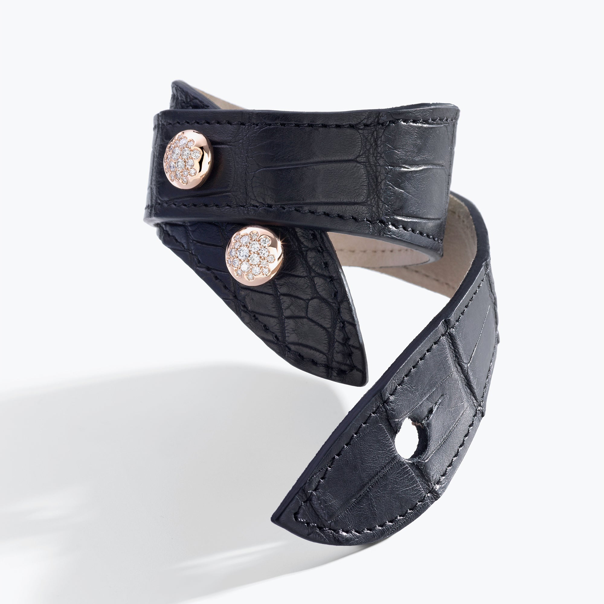Manchette in pelle di alligatore con boule in oro impreziosite da pavé di diamanti. Il design avvolgente e deciso abbraccia il polso come un’armatura di stile, fondendo spirito couture e forza contemporanea. Icona della collezione Glamour, è accompagnata da certificazione CITES relativa alla pelle di alligatore, che ne garantisce l’origine legale e tracciabile.