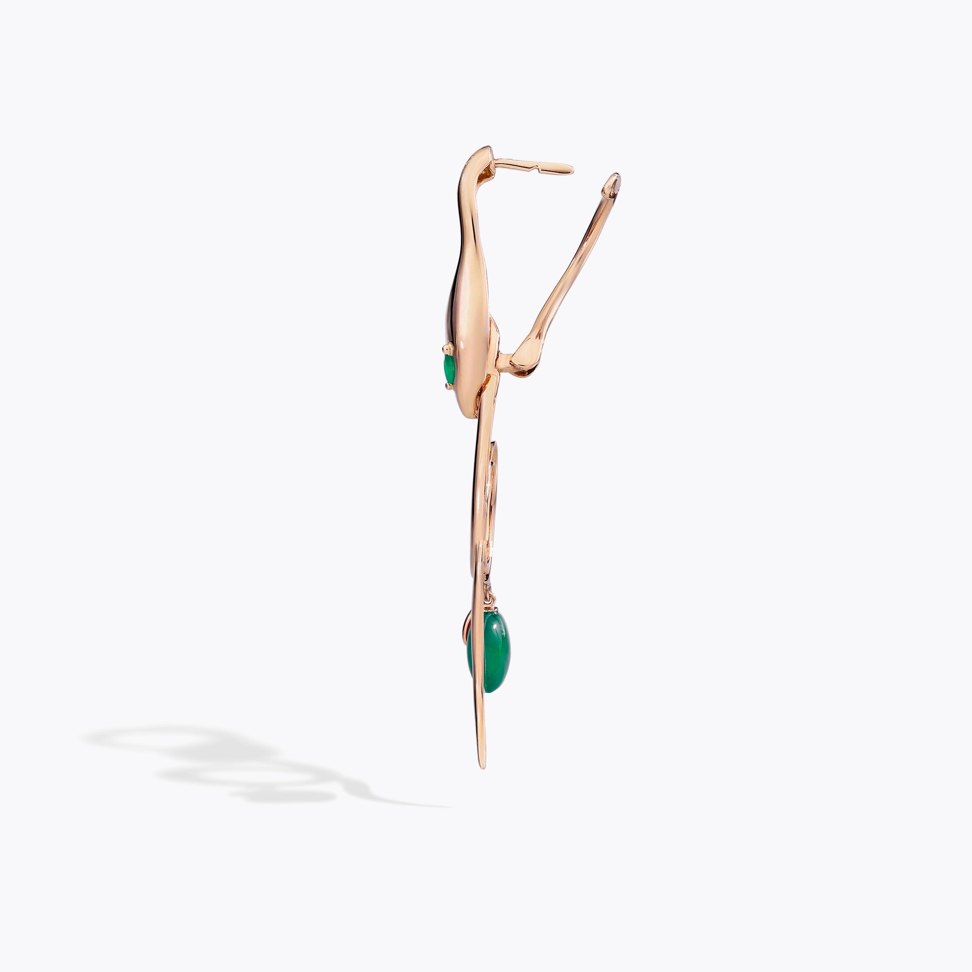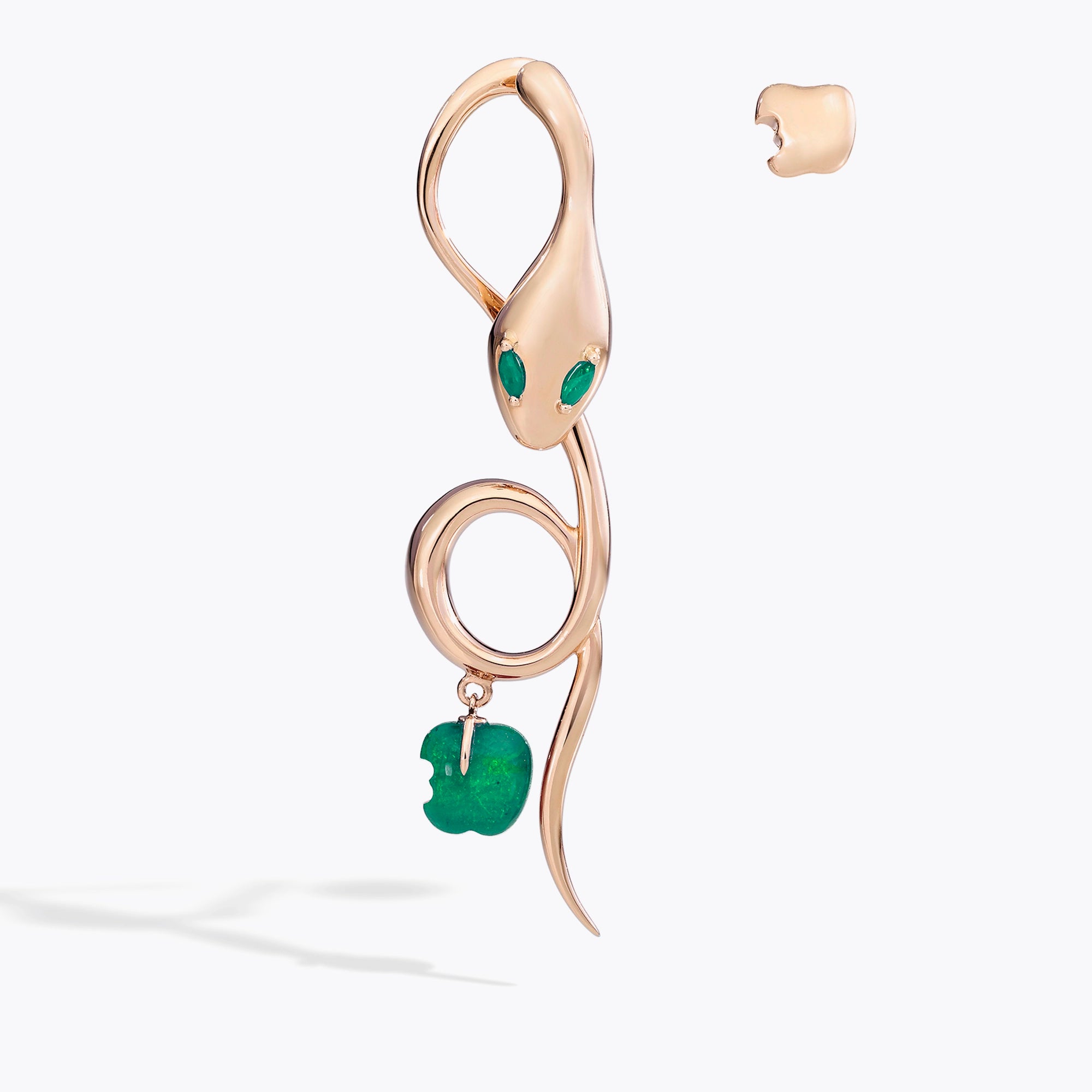 Orecchini della collezione Malafemmina con serpente in oro lucido e occhi in pietre preziose taglio navette. La composizione asimmetrica include un orecchino lungo con melina in pietra naturale pendente e un orecchino a lobo con mela in oro. Un design iconico e giocoso che unisce sensualità e stile scultoreo.Chiusura a battente per una vestibilità sicura e confortevole.