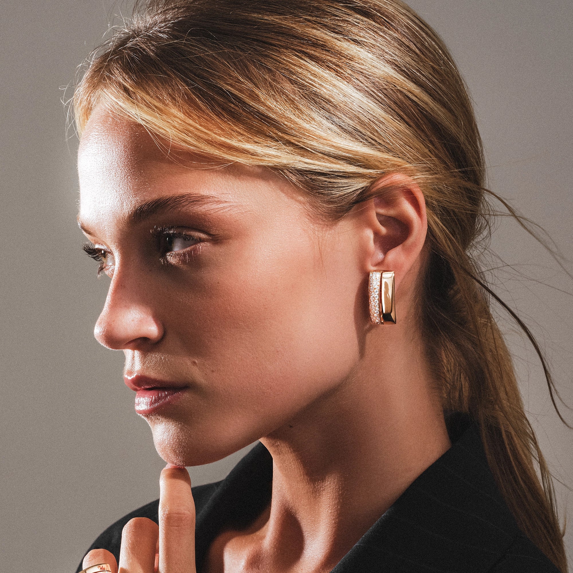 Orecchini a lobo in oro 18k e pavè in diamanti. La forma geometrica dal design minimalista gioca sulla netta separazione tra oro e diamanti, divisi da una linea, uno spazio vuoto, che crea un vibrante contrasto. La pratica chiusura è a perno e a clip.