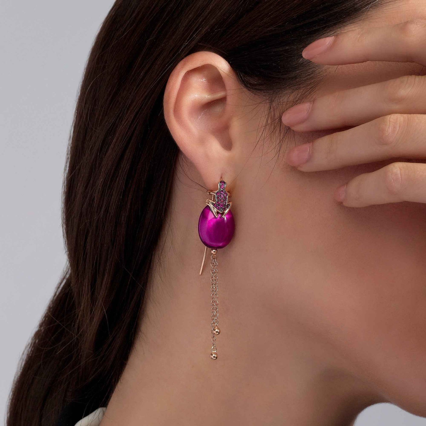 Design inaspettato per gli orecchini Happy Frog asimmetrici: il pendente presenta una pepita colorata su cui si arrampica la rana iconica in oro e pietre preziose, accompagnata da una cascata di catenelle mobili. Il secondo orecchino, a lobo, propone la rana in versione mini. La colorazione è ottenuta tramite verniciatura manuale. Eventuali imperfezioni attestano questa manualità. La colorazione resiste agli agenti atmosferici ma non ai graffi e alle botte. Chiusura ad amo per il pendente, a perno per il lobo.