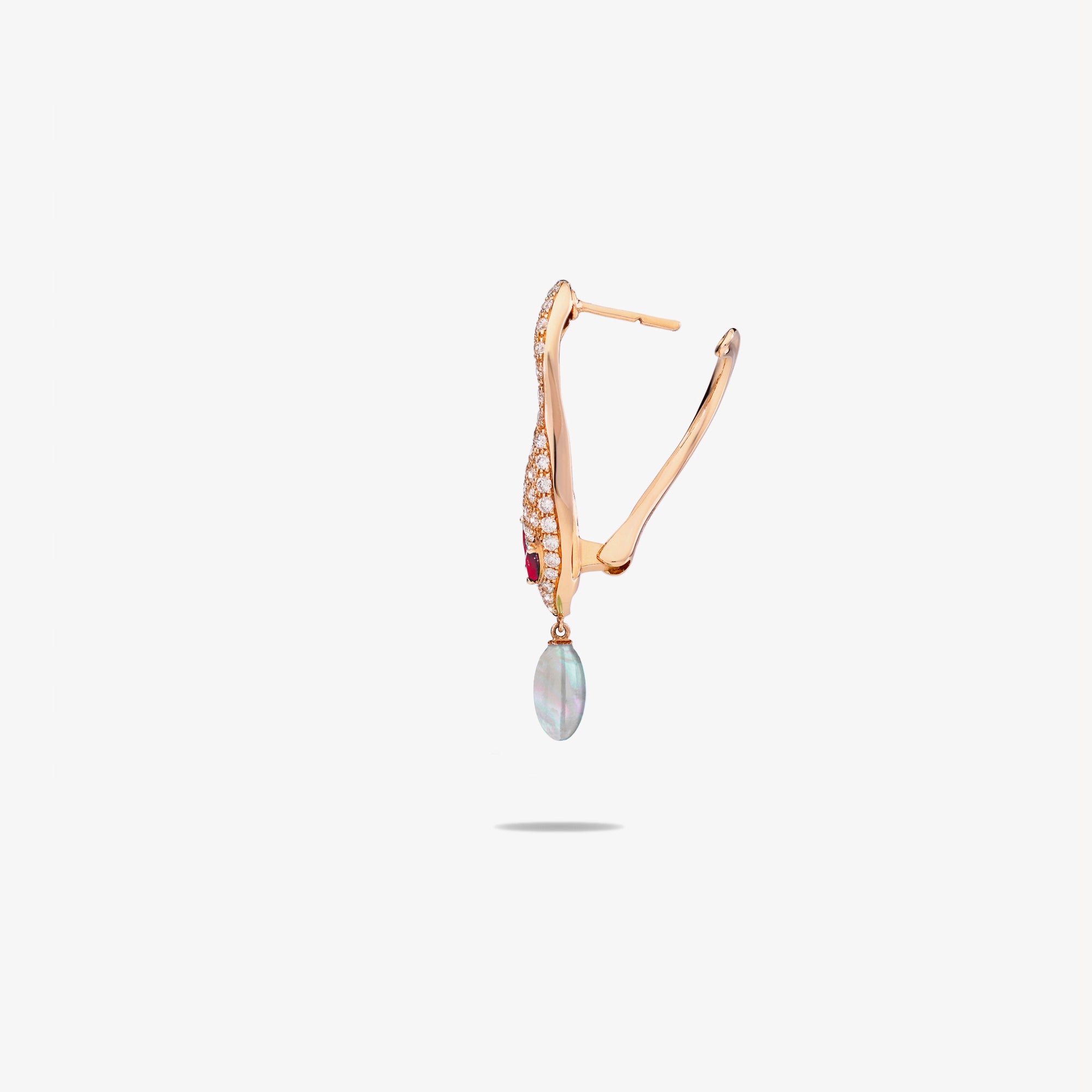 Orecchini asimmetrici della collezione Malafemmina in oro, con serpente impreziosito da pavé di diamanti e occhi in pietre preziose taglio navette. Una melina scolpita in pietra naturale pende da uno degli orecchini, mentre l’altro presenta una mela in pietra a lobo. Chiusura a battente per una vestibilità sicura e confortevole.