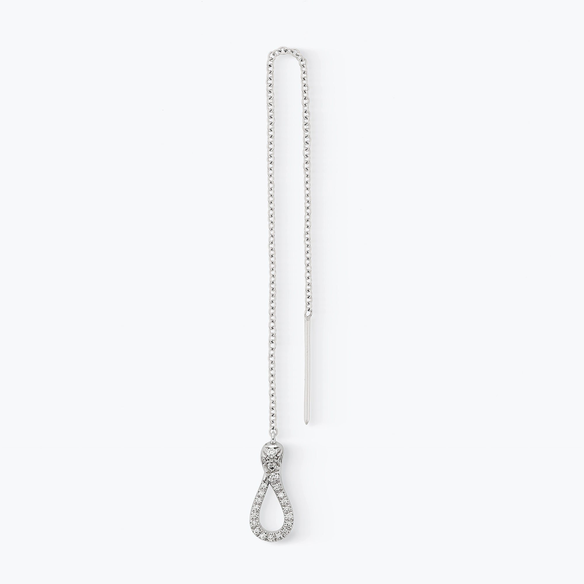 Un modulo Elika Mini da 1,5 cm completamente incassato in pavé di diamanti su entrambi i lati, sospeso su una catenina sottile in oro che si infila direttamente nel foro dell’orecchio. Il movimento segue il corpo, creando un gioco di equilibrio e luce ispirato al volo elicoidale del seme d’acero. L’altezza del modulo è regolabile per uno styling fluido e personale.