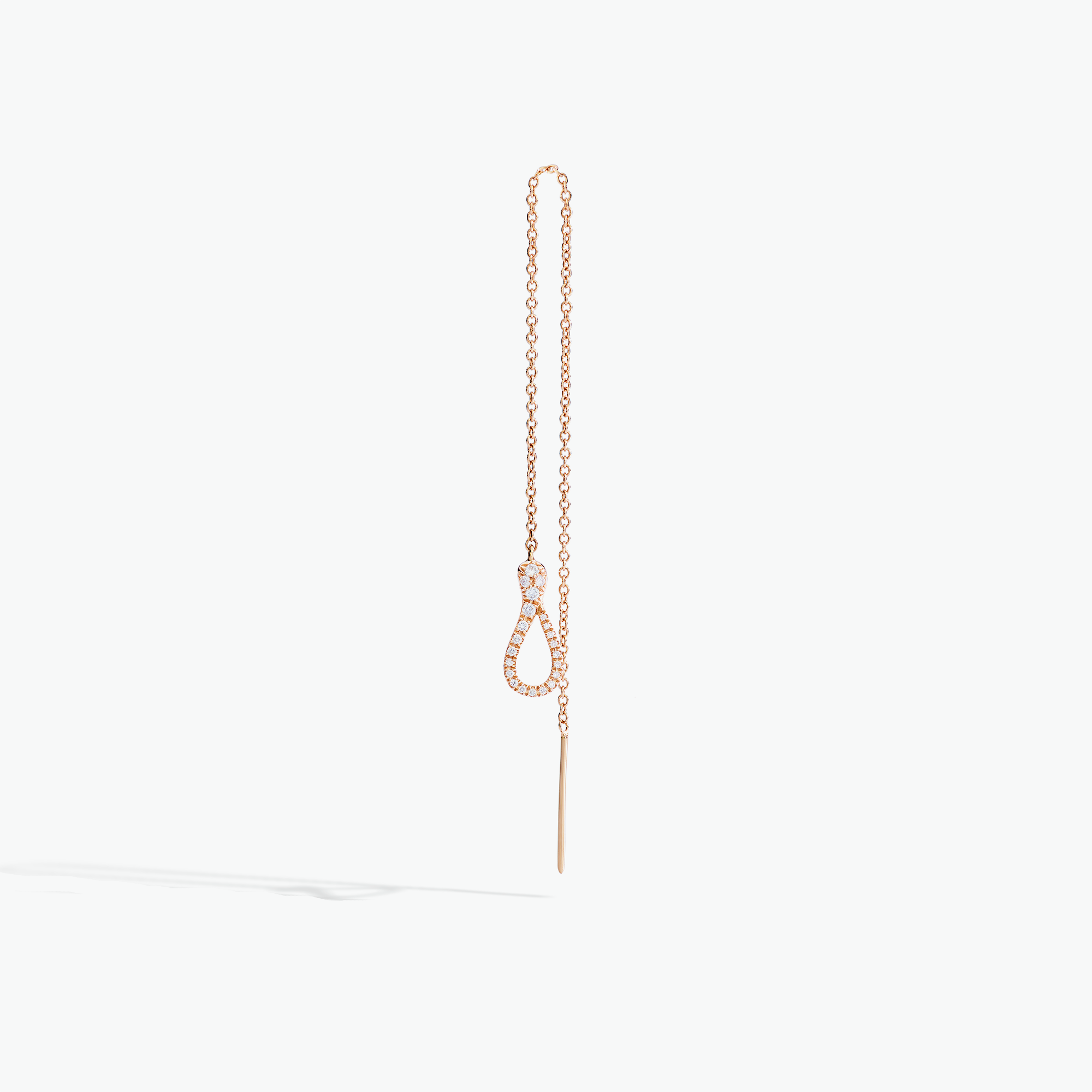Un modulo Elika Mini da 1,5 cm completamente incassato in pavé di diamanti su entrambi i lati, sospeso su una catenina sottile in oro che si infila direttamente nel foro dell’orecchio. Il movimento segue il corpo, creando un gioco di equilibrio e luce ispirato al volo elicoidale del seme d’acero. L’altezza del modulo è regolabile per uno styling fluido e personale.